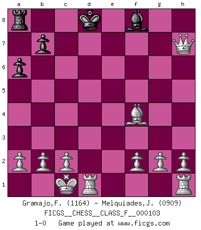 Last move : 1-0 2011 December 1 8:2:58 [Event "FICGS__CHESS__CLASS_F__000103"] [Site "FICGS"] [Date "2011.11.20"] [Round "1"] [White "Gramajo,Francisco"] [Black "Melquiades,Jay"] [Result "1-0"] [WhiteElo "1164"] [BlackElo "0909"] 1.Nf3 f6 2.e4 d5 3.exd5 c6 4.dxc6 Nxc6 5.Bb5 Bd7 6.d4 e5 7.dxe5 Nge7 8.exf6 gxf6 9.Nc3 a6 10.Ne4 Nf5 11.Ne5 Nxe5 12.Qh5+ Nf7 13.Bxd7+ Qxd7 14.Nxf6+ Ke7 15.Nxd7 Kxd7 16.Qxf5+ Kc7 17.Qxf7+ Kb6 18.Qf6+ Ka7 19.Be3+ Kb8 20.Qxh8 Kc7 21.Qxh7+ Kc8 22.Bf4 Kd8 23.O-O-O 1-0 Reti Opening Queenside Castling by player White (move 23) Player White won this chess game. Follow this game move after move (download)One doesn't have to play well, it's enough to play better than your opponent. (Siegbert Tarrasch) Mein erstes Ziel war nicht, die Partie zu gewinnen, sondern eine Figur zu opfern. -- der junge (Wilhelm Steinitz) No solamente yo pronostico su triunfo sobre Botvinnik, sino que me adelanto y digo que probablemente Fischer es el jugador de Ajedrez mas grande que haya existido. (John Collins) Lorsque vous vous retrouvez devant une position atroce, ne tendez pas un ultime piège dérisoire avec l'intention d'abandonner si l'adversaire le déjoue ! Faites-vous plutôt un devoir de résister comme si votre vie en dépendait. Jouez le coup qui vous déplairait au centuple si vous étiez dans la peau de votre tortionnaire ! It is a good thing for an uneducated man to read books of quotations. (Winston Churchill)