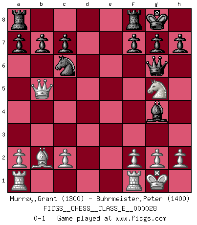 Last move : 0-1 2007 April 7 22:17:45 [Event "FICGS__CHESS__CLASS_E__000028"] [Site "FICGS"] [Date "2007.01.07"] [Round "1"] [White "Murray,Grant"] [Black "Buhrmeister,Peter"] [Result "0-1"] [WhiteElo "1300"] [BlackElo "1400"] 1.e4 e5 2.Nf3 Nc6 3.Nc3 Nf6 4.Bb5 Bb4 5.O-O O-O 6.d4 Bxc3 7.bxc3 Nxe4 8.dxe5 Nxc3 9.Qd3 Nxb5 10.Qxb5 d6 11.exd6 Qxd6 12.Bb2 Bg4 13.Ng5 Qg6 0-1 Four knights : double Ruy Lopez Kingside Castling by player White (move 5) Kingside Castling by player Black (move 5) Player Black won this chess game. Follow this game move after move (download)Suddenly it was obvious to me in my analysis I had missed what Fischer had found with the greatest of ease at the board. (Mikhail Botvinnik) Die unerbitterlichsten Regeln im Schach sind die Ausnahmen. (Savielly Grigorievitsch Tartakower) Nada excita más a Grandes Maestros aburridos que una novedad teórica. (Dominic Lawson) Les pièces de l'échiquier étaient impitoyables. Elles le retenaient, elles l'absorbaient. Il y avait de l'horreur en cela, mais aussi une harmonie unique. Car, qu'y a-t-il dans le monde, à part les échecs ? (V. Nabokov) Creativity is allowing yourself to make mistakes. Art is knowing which ones to keep. (Scott Adams)