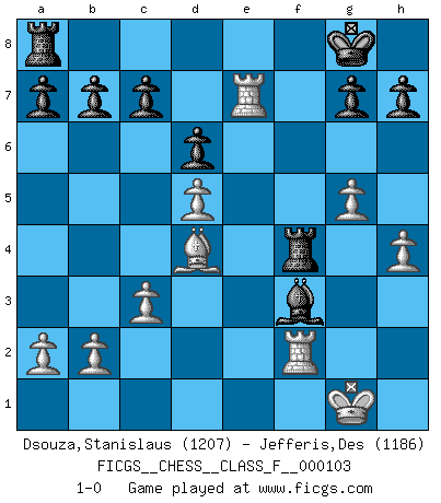 Last move : 1-0 2012 January 12 19:41:51 [Event "FICGS__CHESS__CLASS_F__000103"] [Site "FICGS"] [Date "2011.11.20"] [Round "1"] [White "Dsouza,Stanislaus"] [Black "Jefferis,Des"] [Result "1-0"] [WhiteElo "1207"] [BlackElo "1186"] 1.e4 e5 2.Nf3 Nc6 3.Bc4 d6 4.d3 Be7 5.O-O Bg4 6.h3 Bh5 7.g4 Bg6 8.Be3 Nf6 9.Nc3 O-O 10.Nd5 Nxd5 11.exd5 Nb8 12.c3 Nd7 13.Nd2 f5 14.f3 fxg4 15.fxg4 Bh4 16.Nf3 Bf6 17.g5 Be7 18.h4 Nc5 19.d4 exd4 20.Bxd4 Bh5 21.Be2 Ne4 22.Qd3 Ng3 23.Rf2 Nxe2+ 24.Qxe2 Rf4 25.Re1 Bxf3 26.Qxe7 Qxe7 27.Rxe7 1-0 King's pawn game Kingside Castling by player White (move 5) Kingside Castling by player Black (move 9) Player White won this chess game. Follow this game move after move (download)In order to improve your game, you must study the endgame before everything else, for whereas the endings can be studied and mastered by themselves, the middle game and the opening must be studied in relation to the endgame. (Jose Raul Capablanca) Fischer: 'Remis!?' Uhlmann: 'Aber es muss doch dreimal Zugwiederholung sein!' Fischer: 'Sie nehmen das Remis an, wie ich es sage, sonst spiele ich weiter und werde Sie dann schlagen!' (Robert James Fischer) Bobby es el jugador de Ajedrez mas fino que este país jamás haya producido. Su memoria para las movidas, su brillantez en soñar combinaciones y su feróz determinación por la victoria son algo extraño. (John Collins) Il n'y a plus de joueurs du niveau de Jacob Murray dont la seule quête est le beau jeu, le plaisir de voir les pièces construire quelque chose. Sur 10 idées à la minute, 9 seront sans intérêt, la dernière s'avèrera géniale. (Christian Bauer) Big Chess is a place for big hallucinations. (Thibault de Vassal)