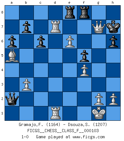 Last move : 1-0 2011 December 14 21:0:50 [Event "FICGS__CHESS__CLASS_F__000103"] [Site "FICGS"] [Date "2011.11.20"] [Round "1"] [White "Gramajo,Francisco"] [Black "Dsouza,Stanislaus"] [Result "1-0"] [WhiteElo "1164"] [BlackElo "1207"] 1.Nf3 d5 2.d4 Bf5 3.Nc3 e6 4.Bg5 Be7 5.Bf4 Nf6 6.e3 Ne4 7.Nxe4 Bxe4 8.Bd3 Bxd3 9.Qxd3 Nc6 10.a3 O-O 11.Bg3 a6 12.O-O f5 13.c4 Na5 14.cxd5 exd5 15.Ne5 Bd6 16.Rfd1 Bxe5 17.dxe5 c6 18.b3 Qe7 19.f4 Qe6 20.Be1 d4 21.Bxa5 dxe3 22.Qxe3 h6 23.Rd6 Qe7 24.Rad1 Kh7 25.Rd7 Qxa3 26.Qc3 Qa2 27.e6 Rae8 28.Qxg7+ 1-0 Reti Opening Kingside Castling by player Black (move 10) Kingside Castling by player White (move 12) Player White won this chess game. Follow this game move after move (download)When you don't know what to do, wait for your opponent to get an idea - it's sure to be wrong. (Tarrasch) Rauchen ist dem Schachspieler bei seiner Arbeit, also im Wettkampf, untersagt. (Viktor Kortschnoi) Si el ingenio solamente fuese necesario para lucirse, las mujeres serían las mejores jugadoras de Ajedrez del mundo. (Albin) La victoire dans une partie d'Echecs appartient la plupart du temps à celui qui voit un peu plus loin que l'adversaire. (Lasker) For a mechanic, you seem to do an excessive amount of thinking. (C-3PO in Star Wars ep.2)