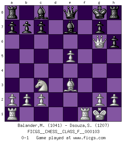 Last move : 0-1 2012 February 20 7:49:39 [Event "FICGS__CHESS__CLASS_F__000103"] [Site "FICGS"] [Date "2011.11.20"] [Round "1"] [White "Balander,Martin"] [Black "Dsouza,Stanislaus"] [Result "0-1"] [WhiteElo "1041"] [BlackElo "1207"] 1.e4 e5 2.Nf3 Nc6 3.Bc4 h6 4.d4 Nf6 5.Nxe5 Nxe5 6.dxe5 Nxe4 7.Bxf7+ Kxf7 8.Qd5+ Ke8 9.Qxe4 Bc5 10.Nc3 Be7 11.f4 d6 12.Be3 dxe5 13.Qg6+ Kf8 14.fxe5 Qe8 15.O-O Kg8 0-1 This chess game has been lost on time (started : 2011.11.20 15:5:21) King's pawn game Kingside Castling by player White (move 15) Player Black won this chess game. Follow this game move after move (download)A passed Pawn increases in strength as the number of pieces on the board diminishes. (Capablanca) Dass jemand wie Surab Asmaiparaschwili, der selbst Elopunkte gekauft hat , Vize-Präsident der Fide werden konnte, sagt schon einges über den Zustand dieser Organisation aus. (Joel Lautier) Un buen jugador siempre tiene buena suerte. (José Raúl Capablanca) L'action d'une oeuvre littéraire se déroule sur un champ de bataille. Les masques et les types du drame moderne correspondent aux pièces du jeu d'échecs. L'intrigue correspond aux coups et aux gambits, c'est à dire aux techniques du jeu telles qu'utilisées et interprétées par les joueurs. Les tactiques et les péripéties [mouvements] correspondent aux coups exécutés par l'adversaire. (Viktor Shklovsky) Quotation,n.: The act of repeating erroneously the words of another. The words erroneously repeated. (Ambrose Bierce, The Devil's Dictionary)