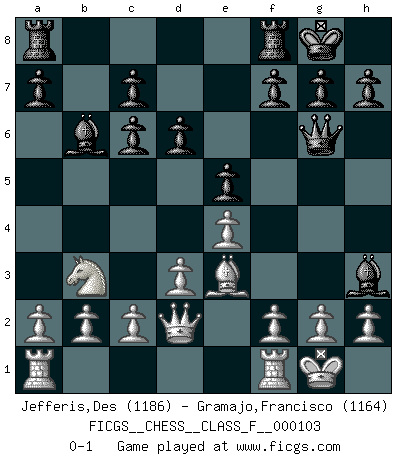 Last move : 0-1 2011 December 14 19:18:10 [Event "FICGS__CHESS__CLASS_F__000103"] [Site "FICGS"] [Date "2011.11.20"] [Round "1"] [White "Jefferis,Des"] [Black "Gramajo,Francisco"] [Result "0-1"] [WhiteElo "1186"] [BlackElo "1164"] 1.e4 Nc6 2.Nf3 e5 3.Bc4 Nf6 4.d3 Bc5 5.O-O d6 6.Nc3 O-O 7.Nd5 Nxd5 8.Bxd5 Qf6 9.Nd2 Qg6 10.Nb3 Bb6 11.Bxc6 bxc6 12.Be3 Bg4 13.Qd2 Bh3 0-1 KP : Nimzovich defense Kingside Castling by player White (move 5) Kingside Castling by player Black (move 6) Player Black won this chess game. Follow this game move after move (download)The chessboard is the world, the pieces are the phenomena of the Universe, the rules of the game are what we call the laws of Nature and the player on the other side is hidden from us. (Thomas Huxley) Wenn Dein Gegner dir ein Remis anbietet, versuch herauszufinden, weshalb er glaubt schlechter zu stehen. (Nigel Short) Tu eres para mi la Reina en d8 y yo soy el Peón en d7!!. (GM Eduard Gufeld) Vous n'êtes pas toujours obligé de jouer le meilleur coup. Un coup doit être actif, entreprenant, correct et beau ! (David Bronstein) Dave, my mind is going. I can feel it. (HAL 9000 in 2001, a space odyssey)