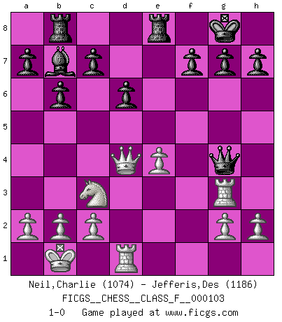 Last move : 1-0 2011 December 22 10:21:58 [Event "FICGS__CHESS__CLASS_F__000103"] [Site "FICGS"] [Date "2011.11.20"] [Round "1"] [White "Neil,Charlie"] [Black "Jefferis,Des"] [Result "1-0"] [WhiteElo "1074"] [BlackElo "1186"] 1.e4 e5 2.Nf3 Nc6 3.d4 exd4 4.Nxd4 Nxd4 5.Qxd4 d6 6.Nc3 Nf6 7.Bg5 Be7 8.O-O-O O-O 9.Bd3 Nd7 10.Bxe7 Qxe7 11.f3 Ne5 12.f4 Nxd3+ 13.Rxd3 b6 14.Qd5 Rb8 15.Rhd1 Bb7 16.Qc4 Qh4 17.Rh3 Qxf4+ 18.Kb1 Qg4 19.Qd4 Rfe8 20.Rg3 1-0 Scotch game Queenside Castling by player White (move 8) Kingside Castling by player Black (move 8) Player White won this chess game. Follow this game move after move (download)After a bad opening, there is hope for the middle game. After a bad middle game, there is hope for the endgame. But once you are in the endgame, the moment of truth has arrived. (Edmar Mednis) Schon mancher Spieler hat aufgegeben, um zu vermeiden, daß er eine Figur verliert. (Savielly Grigorievitsch Tartakower) El jugador táctico sabe que hacer cuando hay algo que hacer; mientras que el estratega sabe que hacer cuando no hay nada que hacer. (Gerald Abrahams) Mais n'est-ce pas déjà le limiter injurieusement que d'appeler les échecs un jeu? N'est-ce pas aussi une science, un art, ou quelque chose qui, comme le cercueil de Mahomet entre ciel et terre, est suspendu entre l'un et l'autre, et qui réunit un nombre incroyable de contraires ? (Stefan Zweig) Computers are like Old Testament gods; lots of rules and no mercy. (Joseph Campbell)
