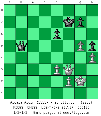 Last move : 1/2-1/2 2011 November 20 21:34:9 [Event "FICGS__CHESS__LIGHTNING_SILVER__000150"] [Site "FICGS"] [Date "2011.11.20"] [Round "1"] [White "Alcala,Alvin"] [Black "Schutte,John"] [Result "1/2-1/2"] [WhiteElo "2322"] [BlackElo "2203"] 1.c4 e6 2.Nf3 Nf6 3.d4 d5 4.g3 dxc4 5.Bg2 a6 6.O-O Nc6 7.e3 Bd7 8.Qe2 b5 9.b3 cxb3 10.axb3 Bd6 11.Bb2 O-O 12.Rc1 Nd5 13.Ne5 Nxe5 14.dxe5 Bb4 15.Nd2 a5 16.Ne4 c6 17.Qh5 Be7 18.Bd4 h6 19.h4 Re8 20.Qg4 a4 21.bxa4 Rxa4 22.Bf1 Qa8 23.Bd3 Qd8 24.Rxa4 bxa4 25.Nc5 a3 26.Qe4 f5 27.exf6 Nxf6 28.Qg6 Bxc5 29.Rxc5 Rf8 30.Bb1 Qe7 31.Ra5 Qb4 32.Bxf6 Rxf6 33.Ra8+ Rf8 34.Qh7+ Kf7 35.Bg6+ Kf6 36.Ra7 Rd8 37.Bh5 Qb2 38.Qg6+ Ke7 39.Bg4 Qa1+ 40.Kg2 Qe5 41.Rxa3 Be8 42.Qc2 c5 43.Bf3 Kf7 44.Ra5 Rc8 45.Qh7 Bd7 46.Ra7 Ke7 47.Qb1 Rd8 48.Qb5 Qd6 49.Bc6 Ke8 50.Rxd7 Rxd7 51.Kh2 Ke7 52.Bxd7 Qxd7 53.Qxc5+ Kf7 54.g4 Qd8 55.Qa7+ Kg8 56.Kh3 h5 57.g5 Qd3 58.Qa8+ Kf7 59.Qb7+ Kg6 60.Kg2 Qc4 61.Qb1+ Kf7 62.Qd1 Kg6 63.Qd4 Qb5 64.Qe4+ Kf7 65.Qf3+ 1/2-1/2 English Opening Kingside Castling by player White (move 6) Kingside Castling by player Black (move 11) This chess game ended in a draw. Follow this game move after move (download)Weak points or holes in the opponent's position must be occupied by pieces not Pawns. (Siegbert Tarrasch) Der Partner hat auch seine Existenzberechtigung. (Savielly Grigorievitsch Tartakower) Los finales de Peón son del Ajedrez lo que el cesped es del Golf. (Cecil Purdy) Celui qui prend des risques peut perdre, celui qui n'en prend pas perd toujours. (Xavier Tartacover) There are two kinds of tragedy in this world, one is not getting what you want and the other is getting. (Lord of war)
