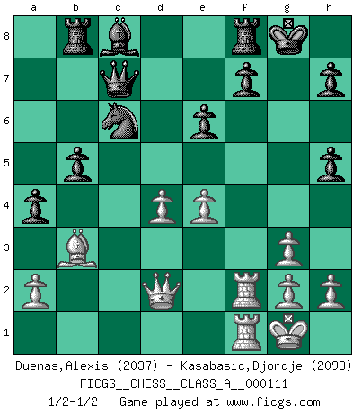 Last move : 1/2-1/2 2012 January 7 14:19:47 [Event "FICGS__CHESS__CLASS_A__000111"] [Site "FICGS"] [Date "2011.11.21"] [Round "1"] [White "Duenas,Alexis"] [Black "Kasabasic,Djordje"] [Result "1/2-1/2"] [WhiteElo "2037"] [BlackElo "2093"] 1.d4 Nf6 2.c4 g6 3.Nc3 d5 4.cxd5 Nxd5 5.e4 Nxc3 6.bxc3 Bg7 7.Bc4 c5 8.Ne2 Nc6 9.Be3 O-O 10.O-O Qc7 11.Rc1 Rd8 12.Bf4 Be5 13.Bg3 Bxg3 14.fxg3 e6 15.Qd2 Rb8 16.Rf2 b5 17.Bb3 a5 18.Rcf1 Rf8 19.Nf4 cxd4 20.cxd4 a4 21.Nh5 gxh5 1/2-1/2 King's Indian defense, 3.Nc3 Kingside Castling by player Black (move 9) Kingside Castling by player White (move 10) This chess game ended in a draw. Follow this game move after move (download)Chess is not like life... it has rules ! (Mark Pasternak) Weshalb minderdergeübte Spieler mit g2-g4 beginnen? Die betreffenden sind unschlüssig, ob sie nun rechts (h4) oder links (f4) beginnen sollen, und in ihrer Ratlosigkeit entschliessen sie sich nach guter Bürgerart dazu, den goldenen Mittelweg zu wählen. (Aaron Nimzowitsch) Tu cuerpo tiene que estar en óptima condición. Tu Ajedrez se deteriora como lo hace tu cuerpo. No puedes separar la mente y el cuerpo. (Bobby Fischer) Le système Elo représente seulement une moyenne. Il est simplement un indicateur de votre stabilité. (Anatoli Karpov) Better than a thousand days of diligent study is one day with a great teacher. (Japanese proverb)