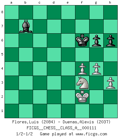 Last move : 1/2-1/2 2012 April 15 13:27:27 [Event "FICGS__CHESS__CLASS_A__000111"] [Site "FICGS"] [Date "2011.11.21"] [Round "1"] [White "Flores,Luis"] [Black "Duenas,Alexis"] [Result "1/2-1/2"] [WhiteElo "2084"] [BlackElo "2037"] 1.e4 e5 2.Nf3 Nc6 3.Bb5 a6 4.Ba4 Nf6 5.O-O Be7 6.Re1 b5 7.Bb3 d6 8.c3 O-O 9.h3 Na5 10.Bc2 c5 11.d4 Qc7 12.Nbd2 cxd4 13.cxd4 Nc6 14.Nb3 a5 15.Be3 a4 16.Nbd2 Bd7 17.Rc1 Qb7 18.Qe2 Rfe8 19.Bd3 Rab8 20.dxe5 Nxe5 21.Nxe5 dxe5 22.Bc5 Bc6 23.Nf3 Bxc5 24.Rxc5 Nd7 25.Rc3 h6 26.Nh4 g6 27.Rec1 Re6 28.Qc2 Rc8 29.b3 axb3 30.Qxb3 Ra8 31.Qc2 Rc8 32.Nf3 Kg7 33.Qb2 Ra8 34.a3 Ra6 35.Rb3 Rb6 36.Rb4 f6 37.Kh2 Rd6 38.Rc3 Nc5 39.Bxb5 Rxb5 40.Rxb5 Qxb5 41.Qxb5 Bxb5 42.Rxc5 Bc6 43.Rc4 Be8 44.Ne1 Rd2 45.f3 f5 46.a4 fxe4 47.Rxe4 Ra2 48.Rxe5 Bxa4 49.Ra5 Bb3 50.Rxa2 Bxa2 51.g4 Bc4 52.Kg3 Kf6 53.f4 Bb5 54.Kf2 Bc6 55.Nf3 Bb7 1/2-1/2 Ruy Lopez : Closed Kingside Castling by player White (move 5) Kingside Castling by player Black (move 8) 10 pieces endgame at move 50 : White KRNPPP , Black KBPP WHITE : King + 1 Rook 1 Knight 3 Pawns BLACK : King + 1 Bishop 2 Pawns 9 pieces endgame at move 50 : White KNPPP , Black KBPP WHITE : King + 1 Knight 3 Pawns BLACK : King + 1 Bishop 2 Pawns This chess game ended in a draw. Follow this game move after move (download)The most important feature of the Chess position is the activity of the pieces. This is absolutely fundamental in all phases of the game: Opening, Middlegame and especially Endgame. The primary constraint on a piece's activity is the Pawn structure. (Michael Stean) Wie kann ich Remis annehmen? Ich weiß ja gar nicht, wie ich stehe! (Fritz Sämisch) Cuando veas una buena jugada, trata de encontrar otra mejor. (Emanuel Lasker) Dans le domaine de la peinture, de la gravure et de la sculpture, dès la première décennie de notre siècle, les artistes abandonnent la représentation de la partie d'échecs pour se concentrer sur les pièces, sur les échiquiers et sur toutes les variations auxquelles les unes et les autres peuvent donner lieu. On passe en quelque sorte d'un thème social à un thème musical (au sens de la musica médiévale, c'est-à-dire d'une notion qui inclue le rythme, l'harmonie, la construction et la déconstruction, etc.). Graphiquement et picturalement, l'échiquier apparaît comme une structure ouverte, dynamique, d'une richesse infinie, autorisant toutes les combinatoires et débouchant sur des mouvements et des rythmes de nature exponentielle. (Michel Pastoureau) Humor is by far the most significant activity of the human brain. (Edward De Bono)