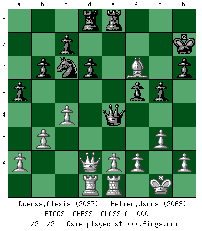 Last move : 1/2-1/2 2012 March 20 1:21:22 [Event "FICGS__CHESS__CLASS_A__000111"] [Site "FICGS"] [Date "2011.11.21"] [Round "1"] [White "Duenas,Alexis"] [Black "Helmer,Janos"] [Result "1/2-1/2"] [WhiteElo "2037"] [BlackElo "2063"] 1.d4 f5 2.Nf3 Nf6 3.g3 b6 4.Bg2 Bb7 5.O-O e6 6.c4 Be7 7.Nc3 Ne4 8.Qc2 Nxc3 9.Qxc3 Bf6 10.Bf4 O-O 11.Qd2 d6 12.Be3 Qe8 13.Rac1 Nd7 14.Rfd1 Be4 15.Ng5 Bxg2 16.Kxg2 h6 17.Nf3 Rd8 18.Qc2 e5 19.dxe5 Bxe5 20.Qd2 a5 21.b3 Kh7 22.Qd3 g6 23.Nxe5 Qxe5 24.Qd2 Rfe8 25.Re1 Qe4+ 26.Kg1 g5 27.Bd4 Ne5 28.Rcd1 Nc6 29.Bf6 1/2-1/2 Dutch Kingside Castling by player White (move 5) Kingside Castling by player Black (move 10) This chess game ended in a draw. Follow this game move after move (download)Good positions don't win games, good moves do. (Gerald Abrahams) Kein Großmeister ist normal. Sie unterscheiden sich nur im Ausmaß Ihrer Verrücktheit. (Viktor Kortschnoi) Un sacrificio se refuta mucho mejor al aceptarlo. (Wilhelm Steinitz) À la honte des hommes, on sait que les lois du jeu sont les seules qui soient partout justes, claires, inviolables et exécutées. Pourquoi l'Indien qui a donné les règles du jeu d'échecs est-il obéi de bon gré dans toute la terre, et que les décrétales des papes, par exemple, sont aujourd'hui un objet d'horreur et de mépris ? C'est que l'inventeur des échecs combina tout avec justesse pour la satisfaction des joueurs, et que les papes, dans leurs décrétales, n'eurent en vue que leur seul avantage. L'Indien voulut exercer également l'esprit des hommes et leur donner du plaisir; les papes ont voulu abrutir l'esprit des hommes. Voltaire (Dictionnaire philosophique / Garnier 1967) God is an atheist. (Unknown)