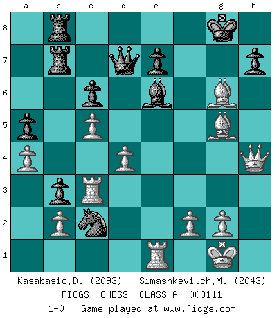 Last move : 1-0 2012 February 24 12:56:4 [Event "FICGS__CHESS__CLASS_A__000111"] [Site "FICGS"] [Date "2011.11.21"] [Round "1"] [White "Kasabasic,Djordje"] [Black "Simashkevitch,Mykola"] [Result "1-0"] [WhiteElo "2093"] [BlackElo "2043"] 1.d4 d5 2.c4 c6 3.Nf3 Nf6 4.Nc3 a6 5.e3 b5 6.c5 g6 7.Bd3 Bg7 8.e4 dxe4 9.Nxe4 O-O 10.Nxf6+ Bxf6 11.Be4 Qc7 12.a4 b4 13.O-O a5 14.Be3 Na6 15.Re1 Be6 16.Ng5 Bxg5 17.Bxg5 Rfd8 18.Rc1 b3 19.h4 Nb4 20.h5 Qd7 21.Qf3 Ra7 22.Qg3 Rb7 23.Qh4 Rdb8 24.hxg6 fxg6 25.Rc3 Nc2 26.Bxg6 1-0 QGD Slav : 4.Nc3 Kingside Castling by player Black (move 9) Kingside Castling by player White (move 13) Player White won this chess game. Follow this game move after move (download)Not all artists are Chess players, but all Chess players are artists. (Marcel Duchamp) Ich rechne überhaupt nicht voraus. Ich gewinne auch so. (Robert James Fischer) Por la belleza de sus partidas, la claridad de su juego y lo brillante de sus ideas, Fischer se creó el mismo como un artista de la misma estatura como Brahms, Rembrandt y Shakespeare. (David Levy) Aidez vos pièces, elles vous aideront. (Paul Morphy) The beginning is the most important part of the work. (Plato)