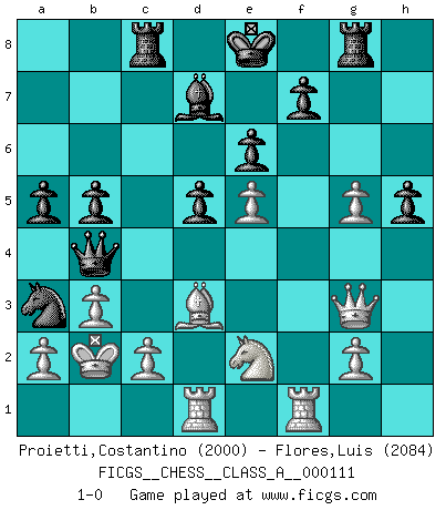 Last move : 1-0 2012 March 30 9:22:12 [Event "FICGS__CHESS__CLASS_A__000111"] [Site "FICGS"] [Date "2011.11.21"] [Round "1"] [White "Proietti,Costantino"] [Black "Flores,Luis"] [Result "1-0"] [WhiteElo "2000"] [BlackElo "2084"] 1.e4 c5 2.Nf3 d6 3.d4 cxd4 4.Nxd4 Nf6 5.Nc3 a6 6.Bg5 e6 7.Qd2 h6 8.Be3 Ng4 9.O-O-O Nxe3 10.Qxe3 Nc6 11.Kb1 Be7 12.f4 Bd7 13.Nf3 b5 14.e5 d5 15.f5 Rb8 16.f6 Bf8 17.fxg7 Bxg7 18.Ne2 Na5 19.Nf4 h5 20.Bd3 Nc4 21.Qf2 a5 22.Rhf1 Qe7 23.Qg3 Qb4 24.b3 Na3+ 25.Kb2 Rc8 26.Ne2 Bh6 27.Ng5 Rg8 28.h4 Bxg5 29.hxg5 1-0 This chess game has been lost on time (started : 2011.11.21 8:38:23) Comment by player 1 : Costantino Proietti : My strong opponent has not left me the pleasure of winning on the board! The game was lost anyway. A difficult game solved with the move 22. Rhf1!! a move that embarrasses the computing power of the engines that fail to serch out 24. b3! and 25. Kb2! It is difficult to believe at this point that the 22nd move wins the game! A possible variation is 29...Nc4+ (what else?) 30. Ka1 h4 31.Qf3 Qe7 32.bxc4 bxc4 33.Bh7 Rxg5 34.c3 Rxe5 35.Bc2 Kf8 36.Rb1 with a winning advantage. Sicilian : Najdorf, 6...e6 Queenside Castling by player White (move 9) Player White won this chess game. Follow this game move after move (download)When you are lonely, when you feel yourself an alien in the world, play Chess. This will raise your spirits and be your counselor in war. (Aristotle) Wie bekannt hörte Morphy 1859 auf, Schach zu spielen. Seine Enttäuschung galt nicht so sehr dem Schach, wie den Schachspielern. (Robert James Fischer) Diferente gente reacciona diferentemente en aceptar la derrota. (Bobby Fischer) La conception d'un plan est le processus par lequel un joueur exploite les avantages de sa position tout en s'efforçant d'en réduire au minimum les inconvénients. Afin de garantir le succès, un plan doit toujours se fonder sur un diagnostic objectif des particularités d'une position. La conception d'un plan est d'autant plus difficile que la position est équilibrée, et grandement facilitée lorsqu'il n'existe qu'un seul plan susceptible de répondre aux exigences de la position. (Harry Golombek) Computers have lots of memory but no imagination. (Anonymous)
