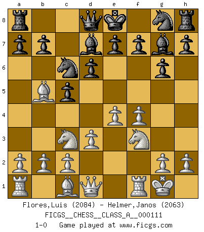 Last move : 1-0 2012 January 18 6:26:44 [Event "FICGS__CHESS__CLASS_A__000111"] [Site "FICGS"] [Date "2011.11.21"] [Round "1"] [White "Flores,Luis"] [Black "Helmer,Janos"] [Result "1-0"] [WhiteElo "2084"] [BlackElo "2063"] 1.e4 c5 2.Nc3 Nc6 3.f4 g6 4.Nf3 Bg7 5.Bb5 d6 6.O-O Bd7 7.d3 1-0 This chess game has been lost on time (started : 2011.11.21 8:38:23) Sicilian : Grand Prix attack Kingside Castling by player White (move 6) Player White won this chess game. Follow this game move after move (download)Not only will I predict his triumph over Botvinnik, but I'll go further and say that he'll probably be the greatest Chess player that ever lived. (John Collins) Es genügt nicht ein guter Spieler zu sein, man muß auch gut spielen. (Siegbert Tarrasch) Una mala movida nulifica cuarenta buenas. (Horowitz) Vous m'avez demandé de vous exposer quel est le fondement de la prière. Je ne fais que préparer les pièces du jeu sur la table... Nous sera-t-il permis d'en adopter les règles et si nous les appliquons scrupuleusement nous ne tarderons pas à faire mat le Roi divin ! Il ne pourra échapper à nos mains. (Sainte Thérèse d'Avila, Chemin de perfection) Begin at the beginning and go on till you come to the end; then stop. (Lewis Carrol, Alice in Wonderland)