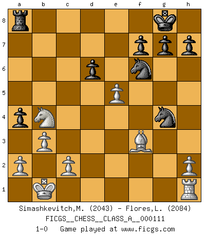 Last move : 1-0 2012 April 6 22:44:55 [Event "FICGS__CHESS__CLASS_A__000111"] [Site "FICGS"] [Date "2011.11.21"] [Round "1"] [White "Simashkevitch,Mykola"] [Black "Flores,Luis"] [Result "1-0"] [WhiteElo "2043"] [BlackElo "2084"] 1.e4 c5 2.Nf3 d6 3.d4 cxd4 4.Nxd4 Nf6 5.Nc3 a6 6.Be3 e5 7.Nb3 Be6 8.f3 Be7 9.Qd2 O-O 10.O-O-O Nbd7 11.g4 b5 12.g5 b4 13.Ne2 Ne8 14.f4 a5 15.Kb1 a4 16.Nbc1 exf4 17.Nxf4 Bxg5 18.Nxe6 Bxe3 19.Nxd8 Bxd2 20.Rxd2 Rxd8 21.Rd4 Rb8 22.Nd3 Ne5 23.Rxb4 Rxb4 24.Nxb4 Nf6 25.Bg2 Neg4 26.b3 Re8 27.Bf3 Ra8 28.e5 1-0 Sicilian : Najdorf, Byrne (English) attack Kingside Castling by player Black (move 9) Queenside Castling by player White (move 10) Player White won this chess game. Follow this game move after move (download)Help your pieces so they can help you. (Paul Morphy) Viele Opfer benötigen überhaupt keine konkrete Berechnung. Es genügt sich die entstehende Position kurz vorzustellen, um uns davon zu überzeugen, dass das Opfer korrekt ist. (Mikhail Nekhemyevich Tal) Los finales de Peón son del Ajedrez lo que el cesped es del Golf. (Cecil Purdy) Demandez au pauvre Cg1 ce qu'il en pense. Eduard Gufeld à propos de la variante Saemisch de l'Est-Indienne. Life is like a ten-speed bicycle: most of us have gears we never use. (Charles M. Schulz)
