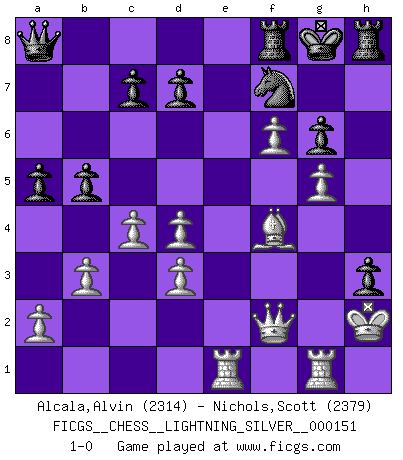 Last move : 1-0 2011 November 21 17:49:2 [Event "FICGS__CHESS__LIGHTNING_SILVER__000151"] [Site "FICGS"] [Date "2011.11.21"] [Round "1"] [White "Alcala,Alvin"] [Black "Nichols,Scott"] [Result "1-0"] [WhiteElo "2314"] [BlackElo "2379"] 1.c4 e5 2.g3 h5 3.Nc3 h4 4.g4 Nc6 5.h3 b6 6.Bg2 Bb7 7.Nf3 Nd4 8.O-O Bd6 9.Nxd4 Bxg2 10.Kxg2 exd4 11.Nb5 f5 12.e3 Nh6 13.exd4 fxg4 14.Re1+ Kf7 15.hxg4 Qf6 16.d3 h3+ 17.Kh1 Kg8 18.Qe2 Rf8 19.Nxd6 Qxd6 20.Be3 a6 21.Rg1 Nf7 22.f4 Rh7 23.Rae1 b5 24.b3 a5 25.f5 Rh4 26.Qf2 Rh8 27.g5 Qa6 28.f6 g6 29.Bf4 Qa8+ 30.Kh2 1-0 English Opening Kingside Castling by player White (move 8) Player White won this chess game. Follow this game move after move (download)In Fischer's hands, a slight theoretical advantage is as good a being a Queen ahead. (Isaac Kashdan) Ich kenne keine einzige Person, die behaupten würde, Garri Kasparow sei ein guter Mensch (Nigel Short) Prefiero perder una partida realmente buena, que ganar una mala. (David Levy) Il vaut toujours mieux jouer un plan faux de façon logique que de n'avoir pas de plan du tout. (Victor Kortchnoï) Imagination is more important than knowledge. Knowledge is limited. Imagination encircles the world. (Albert Einstein)