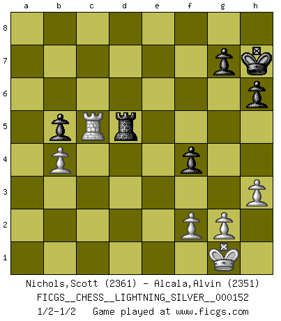 Last move : 1/2-1/2 2011 November 21 19:47:28 [Event "FICGS__CHESS__LIGHTNING_SILVER__000152"] [Site "FICGS"] [Date "2011.11.21"] [Round "1"] [White "Nichols,Scott"] [Black "Alcala,Alvin"] [Result "1/2-1/2"] [WhiteElo "2361"] [BlackElo "2351"] 1.Nf3 c5 2.c4 Nf6 3.Nc3 e6 4.e4 Nc6 5.Be2 e5 6.a3 Be7 7.d3 O-O 8.O-O d6 9.Rb1 a5 10.h3 Bd7 11.Bd2 h6 12.Nd5 Nxd5 13.cxd5 Nb8 14.Ne1 Bg5 15.Nc2 Bf4 16.Bxf4 exf4 17.d4 Na6 18.Bg4 f5 19.exf5 Bxf5 20.Bxf5 Rxf5 21.dxc5 Nxc5 22.b4 axb4 23.axb4 Ne4 24.Nd4 Re5 25.Rc1 Qf6 26.Ne6 Ng5 27.Nxg5 Rxg5 28.Qf3 b5 29.Rce1 Rc8 30.Re6 Rc3 31.Qe4 Qf5 32.Qxf5 Rxf5 33.Rxd6 Rd3 34.Rc1 Rfxd5 35.Rc8+ Kh7 36.Rxd5 Rxd5 37.Rc5 1/2-1/2 Reti Opening Kingside Castling by player Black (move 7) Kingside Castling by player White (move 8) This chess game ended in a draw. Follow this game move after move (download)No price is too great for the scalp of the enemy King. (Koblentz) Bogoljubow: Matt in vier Zügen! Tartakower: Ich verbitte mir jede Belästigung! (Savielly Grigorievitsch Tartakower) Tu puedes aprender mucho mas de una partida que pierdas que de una partida ganada. Tendras que perder cientos de partidas antes de llegar a ser un buen jugador. (Jose Raul Capablanca) 'L'échange des dames est un coup dur pour les deux adversaires...' Un journaliste lors d'une partie du match Spassky-Fischer The meaning of life is that it is to be lived, and it is not to be traded and conceptualized and squeezed into a pattern of systems. (Bruce Lee)