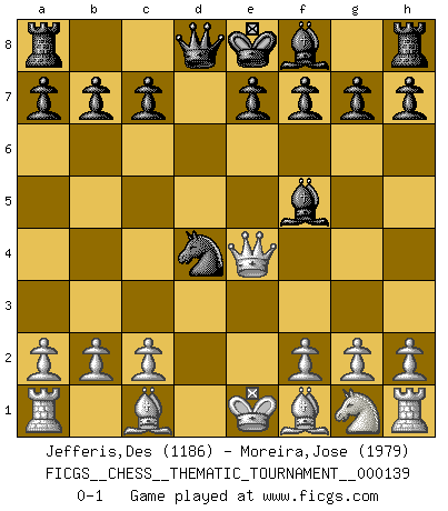 Last move : 0-1 2011 December 10 9:34:1 [Event "FICGS__CHESS__THEMATIC_TOURNAMENT__000139"] [Site "FICGS"] [Date "2011.11.22"] [Round "1"] [White "Jefferis,Des"] [Black "Moreira,Jose"] [Result "0-1"] [WhiteElo "1186"] [BlackElo "1979"] 1.d4 Nf6 2.e4 Nxe4 3.Qe2 d5 4.Nd2 Nc6 5.Nxe4 Nxd4 6.Qd3 dxe4 7.Qxe4 Bf5 0-1 Queen's pawn game Player Black won this chess game. Follow this game move after move (download)I thought the most common mistake [in chess] was the first one: Learning the game :P (Garvin Gray, FICGS forum) Ja, ich habe einmal eine Blitzpartie gespielt, es war in einem Zug, 1929. --im Interview 1989 (Mikhail Moiseyevich Botvinik) El Ajedrez te enseña a controlarl la excitación inicial que sientes cuando vez algo que parece bueno y te enseña a pensar objetivamente cuando te encuentras en problemas. (Stanley Kubrick) A chaque perte on perd un peu de soi. (Joël Lautier) Don't be irreplaceable, if you can't be replaced, you can't be promoted. (Dan Rotaru)