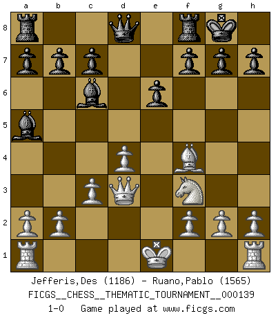 Last move : 1-0 2012 February 22 7:50:27 [Event "FICGS__CHESS__THEMATIC_TOURNAMENT__000139"] [Site "FICGS"] [Date "2011.11.22"] [Round "1"] [White "Jefferis,Des"] [Black "Ruano,Pablo"] [Result "1-0"] [WhiteElo "1186"] [BlackElo "1565"] 1.d4 Nf6 2.e4 Nxe4 3.Qe2 d5 4.Nd2 Nc6 5.Ngf3 e6 6.Nxe4 dxe4 7.Qxe4 Bb4+ 8.c3 Ba5 9.Bb5 Bd7 10.Bf4 O-O 11.Bxc6 Bxc6 12.Qd3 1-0 This chess game has been lost on time (started : 2011.11.22 13:31:50) Queen's pawn game Kingside Castling by player Black (move 10) Player White won this chess game. Follow this game move after move (download)You need not play well - just help your opponent to play badly. (Genrikh Chepukaitis) Es ist nicht das erste mal, dass sich die FIDE dem Arabischen Geld gebeugt hat (über die FIDE WM 2004 in Lybien). (Larry Evans) Por la belleza de sus partidas, la claridad de su juego y lo brillante de sus ideas, Fischer se creó el mismo como un artista de la misma estatura como Brahms, Rembrandt y Shakespeare. (David Levy) Ce n'est pas pour s'amuser qu'il joue aux échecs : il célèbre un culte. (Vladimir Nabokov) At last I discovered the true beauty of chess. So I proposed to her. (Dinesh De Silva)
