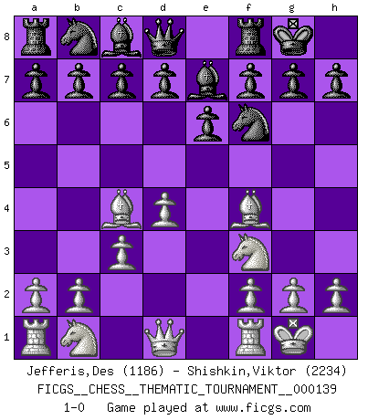 Last move : 1-0 2012 January 7 5:37:49 [Event "FICGS__CHESS__THEMATIC_TOURNAMENT__000139"] [Site "FICGS"] [Date "2011.11.22"] [Round "1"] [White "Jefferis,Des"] [Black "Shishkin,Viktor"] [Result "1-0"] [WhiteElo "1186"] [BlackElo "2234"] 1.d4 Nf6 2.e4 Nxe4 3.Nf3 Nf6 4.Bc4 e6 5.c3 Be7 6.O-O O-O 7.Bf4 1-0 This chess game has been lost on time (started : 2011.11.22 13:31:50) Queen's pawn game Kingside Castling by player White (move 6) Kingside Castling by player Black (move 6) Player White won this chess game. Follow this game move after move (download)Only sissies Castle. (Rob Sillars) Ich könnte leicht behaupten: Ja,ja, Leonid Breschnew wollte nicht, daß ich Weltmeister werde. In der Tat war die Sache komplizierter. (Viktor Kortschnoi) El Ajedrez no es como la vida... ¡tiene reglas!. (Mark Pasternak) Si le désir cupide (et stupide) de gagner est une inépuisable source de souffrance, une combinaison brillante sur l'échiquier est une découverte : le coquelicot qui s'épanouit lorsque apparaît la Voie Lactée. (Arrabal) Lottery : A tax on people who are bad at math. (Author unknown)