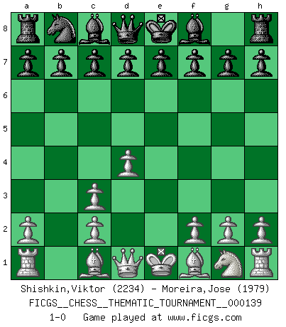 Last move : 1-0 2012 January 30 6:36:29 [Event "FICGS__CHESS__THEMATIC_TOURNAMENT__000139"] [Site "FICGS"] [Date "2011.11.22"] [Round "1"] [White "Shishkin,Viktor"] [Black "Moreira,Jose"] [Result "1-0"] [WhiteElo "2234"] [BlackElo "1979"] 1.d4 Nf6 2.e4 Nxe4 3.Nc3 Nxc3 4.bxc3 1-0 This chess game has been lost on time (started : 2011.11.22 13:31:50) Queen's pawn game Player White won this chess game. Follow this game move after move (download)The enormous mental resilience, without which no Chess player can exist, was so much taken up by Chess that he could never free his mind of this game. (Albert Einstein) Vielleicht wirkt die Aura früherer Spieler glanzvoller als die der heutigen Spieler, aber das liegt daran, dass man kein Programm wie Fritz hatte, das einem all die Löcher in ihren Partien zeigt. (Vladimir Kramnik) Debió haber existido una vez en que los hombres eran semidióses, de otra manera no hubiesen podido inventar el Ajedrez. (Gustav Schenk) La conception d'un plan est le processus par lequel un joueur exploite les avantages de sa position tout en s'efforçant d'en réduire au minimum les inconvénients. Afin de garantir le succès, un plan doit toujours se fonder sur un diagnostic objectif des particularités d'une position. La conception d'un plan est d'autant plus difficile que la position est équilibrée, et grandement facilitée lorsqu'il n'existe qu'un seul plan susceptible de répondre aux exigences de la position. (Harry Golombek) Hardware: the parts of a computer that can be kicked. (Jeff Persis)