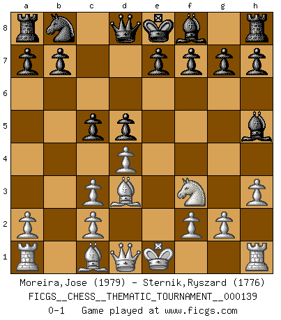 Last move : 0-1 2012 January 12 17:51:37 [Event "FICGS__CHESS__THEMATIC_TOURNAMENT__000139"] [Site "FICGS"] [Date "2011.11.22"] [Round "1"] [White "Moreira,Jose"] [Black "Sternik,Ryszard"] [Result "0-1"] [WhiteElo "1979"] [BlackElo "1776"] 1.d4 Nf6 2.e4 Nxe4 3.Nf3 d5 4.Bd3 Bg4 5.Nc3 Nxc3 6.bxc3 c5 7.h3 Bh5 0-1 This chess game has been lost on time (started : 2011.11.22 13:31:50) Queen's pawn game Player Black won this chess game. Follow this game move after move (download)A man that will take back a move at Chess will pick a pocket. (Richard Fenton) Ich liebe den Moment, wenn ich das Ego meines Gegenüber breche. (Robert James Fischer) En el tablero, la mentira e hipocresía no sobreviven mucho. (Emanuel Lasker) Vous m'avez demandé de vous exposer quel est le fondement de la prière. Je ne fais que préparer les pièces du jeu sur la table... Nous sera-t-il permis d'en adopter les règles et si nous les appliquons scrupuleusement nous ne tarderons pas à faire mat le Roi divin ! Il ne pourra échapper à nos mains. (Sainte Thérèse d'Avila, Chemin de perfection) The obstacle is the path. (Zen proverb)