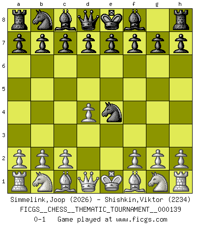 Last move : 0-1 2011 December 24 21:34:45 [Event "FICGS__CHESS__THEMATIC_TOURNAMENT__000139"] [Site "FICGS"] [Date "2011.11.22"] [Round "1"] [White "Simmelink,Joop"] [Black "Shishkin,Viktor"] [Result "0-1"] [WhiteElo "2026"] [BlackElo "2234"] 1.d4 Nf6 2.e4 Nxe4 0-1 Queen's pawn game Player Black won this chess game. Follow this game move after move (download)Chess, like any creative activity, can exist only through the combined efforts of those who have creative talent, and those who have the ability to organize their creative work. (Mikhail Botvinnik) Frage des Reporters: -Worin besteht das Ziel von Gambiteröffnungen? Antwort: -Auf Kosten der Partie einen Ruf als Angriffspieler zu erwerben.- (Siegbert Tarrasch) Después de la respuesta de las negras a 1.e4 con 1..e5, se quedan siempre tratando de entrar dentro del juego. (Howard Staunton) Toutes les manuvres exécutées sur une colonne ouverte ont pour but ultime l'intrusion définitive sur la septième ou la huitième rangée, en plein cur de la position ennemie. (Aaron Nimzovitch) When the going gets tactical, the computers get going. (Hyatt)