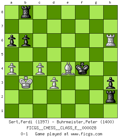 Last move : 0-1 2007 June 18 14:3:11 [Event "FICGS__CHESS__CLASS_E__000028"] [Site "FICGS"] [Date "2007.01.07"] [Round "1"] [White "Sert,Ferdi"] [Black "Buhrmeister,Peter"] [Result "0-1"] [WhiteElo "1397"] [BlackElo "1400"] 1.e4 c5 2.Nc3 e6 3.Nf3 Nc6 4.d4 cxd4 5.Nxd4 Qc7 6.Be3 a6 7.Qd2 Nf6 8.O-O-O Bb4 9.f3 Ne5 10.Kb1 Bxc3 11.Qxc3 Qxc3 12.bxc3 d5 13.Bg5 dxe4 14.Bxf6 gxf6 15.fxe4 Ke7 16.Nf3 b6 17.Be2 Rg8 18.Nxe5 fxe5 19.Bf3 Bb7 20.Rd3 Rac8 21.Rhd1 Bc6 22.Kb2 f5 23.Re1 Bb5 24.exf5 Bxd3 25.cxd3 Rc5 26.fxe6 Kxe6 27.a4 Kd6 28.Be4 R5c8 29.Re3 h5 30.Rh3 Rg5 31.Rf3 Rxg2+ 32.Kb3 Rb8 33.Rf6+ Ke7 34.Rf5 Rxh2 35.Rxe5+ Kd6 36.Rg5 h4 37.Rg6+ Ke5 38.Rh6 Kf4 39.c4 h3 0-1 Sicilian : Closed Queenside Castling by player White (move 8) Player Black won this chess game. Follow this game move after move (download)You must take your opponent into a deep dark forest where 2+2=5, and the path leading out is only wide enough for one. (Mikhail Tal) Das Schach hält seine Meister in eigenen Banden, Fesseln; auf vielerlei Weise formt es ihren Geist, so dass die innere Freiheit selbst des Stärksten beeinflusst wird. (Albert Einstein) Muchos se han convertido en Maestros de Ajedrez, nadie se ha convertido en el Maestro del Ajedrez. (Siegbert Tarrasch) Assurément je connaissais par expérience le mystérieux attrait de ce jeu royal, le seul entre tous les jeux inventés par les hommes qui échappe souverainement à la tyrannie du hasard, le seul où l'on ne doive sa victoire qu'à son intelligence ou plutôt à une certaine forme d'intelligence. Mais n'est-ce pas déjà le limiter injurieusement que d'appeler les échecs un jeu ? N'est-ce pas une science, un art ou quelque chose qui, comme le cercueil de Mahomet entre ciel et terre, est suspendu entre l'un et l'autre, et qui réunit un nombre incroyable de contraires ? [...] C'est une pensée qui ne mène à rien, une mathématique qui n'établit rien, un art qui ne laisse pas d'uvre, une architecture sans matière; et il l'a prouvé néanmoins qu'il était plus durable, à sa manière, que les livres ou que tout autre monument, ce jeu unique qui appartient à tous les peuples et à tous les temps, et dont personne ne sait quel dieu en fit don à la terre pour tuer l'ennui, pour aiguiser l'esprit et stimuler l'âme. Où commence-t-il, où finit-il ? (Stefan Zweig) Information on the Internet is subject to the same rules and regulations as conversation at a bar. (George Lundberg)