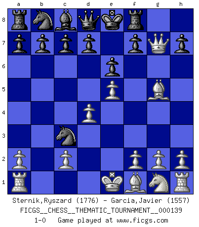 Last move : 1-0 2011 November 30 14:38:40 [Event "FICGS__CHESS__THEMATIC_TOURNAMENT__000139"] [Site "FICGS"] [Date "2011.11.22"] [Round "1"] [White "Sternik,Ryszard"] [Black "Garcia,Javier"] [Result "1-0"] [WhiteElo "1776"] [BlackElo "1557"] 1.d4 Nf6 2.e4 e6 3.Nc3 Bb4 4.e5 Nd5 5.Qg4 Bxc3+ 6.bxc3 Nxc3 7.Qxg7 Rf8 8.Bg5 1-0 Queen's pawn game Player White won this chess game. Follow this game move after move (download)Fischer is the strongest player in the world. In fact, the strongest player who ever lived. (Larry Evans) Wenn sie aufgeben, dann danke ich Ihnen für das Spiel (Eventualzug beim Fernschach). (Anonymous) El Ajedrez es tan interesante por sí solo, que no es necesario un interés monetario para persuadir a una persona a que lo practique; por lo tanto, nunca se juega por dinero. (Benjamin Franklin) Je fais ceci parce que dans cinquante coups j'obtiendrai cela; je m'appelle Mikhail Moisevitch Botvinnik. (Botvinnik) A mistake is only a mistake if you let it happen twice. Otherwise it is a learning experience. (Daniel Parmet)