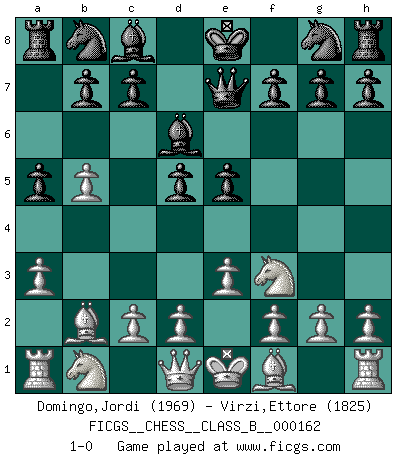 Last move : 1-0 2012 January 5 5:34:18 [Event "FICGS__CHESS__CLASS_B__000162"] [Site "FICGS"] [Date "2011.11.22"] [Round "1"] [White "Domingo,Jordi"] [Black "Virzi,Ettore"] [Result "1-0"] [WhiteElo "1969"] [BlackElo "1825"] 1.b4 e5 2.a3 d5 3.Bb2 a5 4.b5 Bd6 5.Nf3 Qe7 6.e3 1-0 This chess game has been lost on time (started : 2011.11.22 22:39:57) Polish (Sokolsky) opening Player White won this chess game. Follow this game move after move (download)The combination player thinks forward; he starts from the given position, and tries the forceful moves in his mind. (Emanuel Lasker) Es gibt keine einzige Frau, der ich nicht einen Springer vorgeben könnte und trotzdem gewänne. (Robert James Fischer) El Ajedrez es la vida. (Bobby Fischer) Tous ces prétendus hommes politiques sont les pions, les Cavaliers, les Tours ou les Fous d'une partie d'échecs qui se jouera tant qu'un hasard ne renversera pas l'échiquier. (Honoré de Balzac) I'll be back. (Arnold Schwarzenegger)
