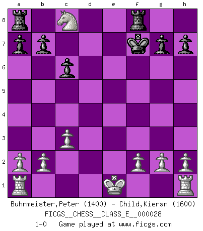 Last move : 1-0 2007 April 15 5:9:6 [Event "FICGS__CHESS__CLASS_E__000028"] [Site "FICGS"] [Date "2007.01.07"] [Round "1"] [White "Buhrmeister,Peter"] [Black "Child,Kieran"] [Result "1-0"] [WhiteElo "1400"] [BlackElo "1600"] 1.e4 e5 2.Nf3 f5 3.Nxe5 Qf6 4.Nc4 fxe4 5.Nc3 Qg6 6.d3 Bb4 7.Bd2 Nf6 8.Nxe4 Nxe4 9.Bxb4 Nc6 10.dxe4 Qxe4+ 11.Be2 Nxb4 12.Ne3 O-O 13.c3 Nc6 14.Qd5+ Qe6 15.Bc4 Ne7 16.Qh5 d5 17.Bxd5 Nxd5 18.Qxd5 Qxd5 19.Nxd5 c6 20.Ne7+ Kf7 21.Nxc8 1-0 Latvian counter-gambit Kingside Castling by player Black (move 12) Player White won this chess game. Follow this game move after move (download)A thorough understanding of the typical mating continuations makes the most complicated sacrificial combinations leading up to them not only not difficult, but almost a matter of course. (Siegbert Tarrasch) Ein Großmeister muß tausende Partien in seinem Kopf speichern, denn diese sind für Ihn, was die Worte der Muttersprache für gewöhnliche Leute sind, oder Noten für Musiker... (Garry Kasparov) La vida es como el Ajedrez, con lucha, competición y eventos buenos y malos. (Benjamin Franklin) Donnez-moi un Cavalier en 6e et je gagnerais toutes mes parties. (Steinitz) Any activity becomes creative when the doer cares about doing it right or doing it better. (John Updike)