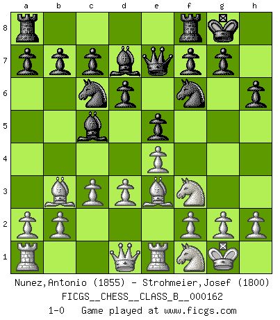Last move : 1-0 2012 February 5 17:57:19 [Event "FICGS__CHESS__CLASS_B__000162"] [Site "FICGS"] [Date "2011.11.22"] [Round "1"] [White "Nunez,Antonio"] [Black "Strohmeier,Josef"] [Result "1-0"] [WhiteElo "1855"] [BlackElo "1800"] 1.e4 e5 2.Nf3 Nc6 3.Bc4 Bc5 4.c3 Nf6 5.d3 d6 6.Bb3 h6 7.O-O O-O 8.Re1 Bg4 9.Nbd2 Bd7 10.Nf1 Qe7 11.Be3 1-0 Giuoco Piano Kingside Castling by player White (move 7) Kingside Castling by player Black (move 7) Player White won this chess game. Follow this game move after move (download)After a bad opening, there is hope for the middle game. After a bad middle game, there is hope for the endgame. But once you are in the endgame, the moment of truth has arrived. (Edmar Mednis) Die westlichen Werte sind eine Sprache, welche die Putin-Administration nicht versteht. (Garry Kasparov) El Ajedrez es tortura mental. (Garry Kasparov) On peut tirer plus d'utilité d'une partie perdue que de 100 parties gagnées. (Capablanca) Creativity involves breaking out of established patterns in order to look at things in a different way. (Edward De Bono)