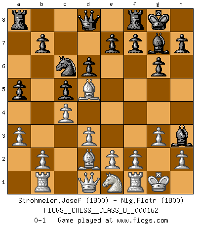 Last move : 0-1 2012 February 5 17:55:16 [Event "FICGS__CHESS__CLASS_B__000162"] [Site "FICGS"] [Date "2011.11.22"] [Round "1"] [White "Strohmeier,Josef"] [Black "Nig,Piotr"] [Result "0-1"] [WhiteElo "1800"] [BlackElo "1800"] 1.c4 Nf6 2.Nc3 g6 3.g3 Bg7 4.Bg2 O-O 5.Nf3 d6 6.O-O c5 7.d3 Nc6 8.a3 Ne8 9.Bd2 Nc7 10.Rb1 a5 11.Ne1 Bd7 12.Nd5 Nxd5 13.Bxd5 Bh3 0-1 English Opening Kingside Castling by player Black (move 4) Kingside Castling by player White (move 6) Player Black won this chess game. Follow this game move after move (download)First-class players lose to second class players because second-class players sometimes play a first-class game. (Tarrasch) Es ist nicht das erste mal, dass sich die FIDE dem Arabischen Geld gebeugt hat (über die FIDE WM 2004 in Lybien). (Larry Evans) De todos mis libros Rusos, la defensa contiene y difunde el 'calor' mas grande que pudiese verse extraño al observar lo supremamente abstracto que el Ajedrez supuestamente es. (Vladimir Nabokov) Il a essayé de se convaincre qu'il pourrait empêcher toutes les erreurs et ne jamais perdre. L'horreur ! Gary Kasparov au sujet de Robert Fischer. All the troubles of the world come from being unable to sit alone in a quiet room. (Blaise Pascal)