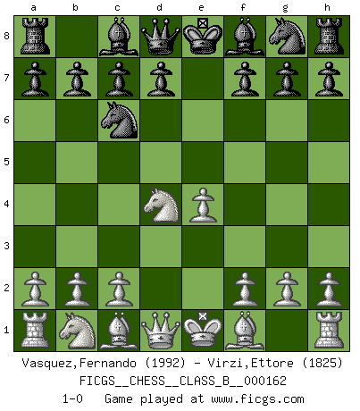 Last move : 1-0 2012 January 2 17:35:4 [Event "FICGS__CHESS__CLASS_B__000162"] [Site "FICGS"] [Date "2011.11.22"] [Round "1"] [White "Vasquez,Fernando"] [Black "Virzi,Ettore"] [Result "1-0"] [WhiteElo "1992"] [BlackElo "1825"] 1.e4 e5 2.Nf3 Nc6 3.d4 exd4 4.Nxd4 1-0 This chess game has been lost on time (started : 2011.11.22 22:39:57) Scotch game Player White won this chess game. Follow this game move after move (download)Life is a kind of Chess, with struggle, competition, good and ill events. (Benjamin Franklin) Schachspieler können ausgezeichnet Varianten am Schachbrett berechnen, aber nicht im realen Leben. Zu stark ist der Individualismus im Schach ausgeprägt, und für viele ist ein kleiner momentaner persönlicher Vorteil wichtiger als ein weit größerer Vorteil von morgen. (Anatoly Karpov) Los Peones son nacidos libres, y aún así, se encuentran encadenados por todos lados. (Rick Kennedy) Ce qui caractérise les parties de combat, c'est que si le défenseur a constamment de difficiles problèmes à résoudre, l'attaquant doit chercher sans relâche de nouvelles possibilités d'attaque. (Koblentz) Luck never gives; it only lends. (Swedish proverb)