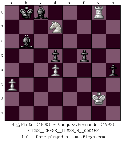 Last move : 1-0 2013 October 3 5:54:53 [Event "FICGS__CHESS__CLASS_B__000162"] [Site "FICGS"] [Date "2011.11.22"] [Round "1"] [White "Nig,Piotr"] [Black "Vasquez,Fernando"] [Result "1-0"] [WhiteElo "1800"] [BlackElo "1992"] 1.d4 d5 2.c4 e6 3.Nc3 Be7 4.Nf3 Nf6 5.Bg5 h6 6.Bh4 O-O 7.e3 b6 8.Be2 Bb7 9.Bxf6 Bxf6 10.cxd5 exd5 11.b4 c6 12.Qb3 Qd6 13.O-O Nd7 14.e4 Be7 15.exd5 cxd5 16.Rfe1 a6 17.Bd3 Nf6 18.b5 a5 19.Ne5 Rac8 20.Re3 Rc7 21.g3 Rfc8 22.Bf5 Re8 23.Bh3 Bf8 24.Na4 Ne4 25.Rd1 Rd8 26.f3 Ng5 27.Bg4 g6 28.h4 Nh7 29.Qd3 Nf6 30.Bh3 Nh5 31.Kg2 Bg7 32.Bg4 Nf6 33.Bh3 Re8 34.Rd2 R8e7 35.Qa3 Ne8 36.Qd3 Bf8 37.Rde2 Ng7 38.Re1 Nh5 39.Bg4 Nf6 40.Bh3 Bg7 41.Nc3 Qb4 42.Rd1 Nh7 43.h5 gxh5 44.Bf5 Nf8 45.f4 Re8 46.Kg1 R8e7 47.Ra1 Ne6 48.Rd1 a4 49.a3 Qd6 50.Qe2 h4 51.Qg4 Nf8 52.Red3 Ne6 53.gxh4 h5 54.Qg3 Re8 55.Rf1 Kf8 56.Re1 Bf6 57.Bxe6 fxe6 58.f5 Rd8 59.Ne2 Rg7 60.Ng6+ Kf7 61.Nef4 exf5 62.Re6 Qxe6 63.Nxe6 Kxe6 64.Kf1 Rdg8 65.Re3+ Kf7 66.Ne5+ Kf8 67.Qf2 Rg1+ 68.Qxg1 Rxg1+ 69.Kxg1 Ke8 70.Rg3 Kd8 71.Rg6 Bxh4 72.Rxb6 Kc8 73.Rg6 Be1 74.Kg2 Ba5 75.Nd3 Kc7 76.Nc5 Bc8 77.Nxa4 h4 78.b6+ Kb7 79.Nc5+ Kb8 80.Rg8 Bxb6 81.Nd7+ 1-0 QGD : Charousek (Petrosian) variation Kingside Castling by player Black (move 6) Kingside Castling by player White (move 13) Player White won this chess game. Follow this game move after move (download)Chess problems demand from the composer the same virtues that characterize all worthwhile art: originality, invention, conciseness, harmony, complexity, and splendid insincerity. (Vladimir Nabokov) Im Internet Chess Club betrug mein Rating vorübergehend 3350 ELO-Punkte. (Sergej Karjakin) Para mi, el Ajedrez es la vida y cada partida es como una nueva vida. Todo jugador de Ajedrez suele vivir muchas vidas durante su vida. (Eduard Gufeld) Même un GMI sait rarement calculer sur plus de cinq coups une attaque à sacrifices. (Rudolf Spielmann) The only thing that overcomes hard luck is hard work. (Harry Golden)