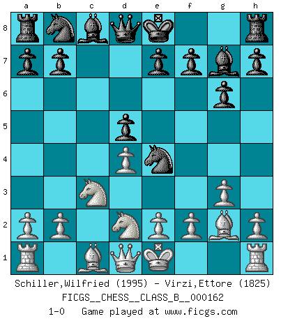 Last move : 1-0 2012 January 2 17:35:4 [Event "FICGS__CHESS__CLASS_B__000162"] [Site "FICGS"] [Date "2011.11.22"] [Round "1"] [White "Schiller,Wilfried"] [Black "Virzi,Ettore"] [Result "1-0"] [WhiteElo "1995"] [BlackElo "1825"] 1.d4 Nf6 2.c4 g6 3.g3 c6 4.Nf3 d5 5.Bg2 Bg7 6.cxd5 cxd5 7.Nc3 Ne4 8.Nd2 1-0 This chess game has been lost on time (started : 2011.11.22 22:39:57) King's Indian : 3.g3 Player White won this chess game. Follow this game move after move (download)When I asked Fischer why he had not played a certain move in our game, he replied: 'Well, you laughed when I wrote it down !' (Mikhail Tal) Ich liebe den Moment, wenn ich das Ego meines Gegenüber breche. (Robert James Fischer) Fischer sacrificó virtualmente todo lo que la mayoría de nosotros los 'debiles' (término que él usa) valoramos, respetamos y apreciamos por el amor de un astuto, a menudo hermoso tablero de juego, por el privilegio ambivalente de ser su mas grande maestro. (Paul Kollar) A chaque perte on perd un peu de soi. (Joël Lautier) After growing wildly for years, the field of computing appears to be reaching its infancy. (John Pierce)