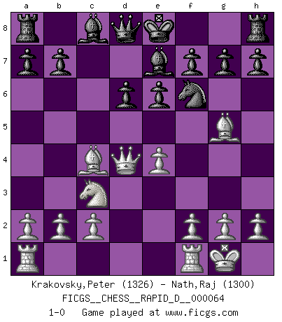 Last move : 1-0 2012 January 3 9:54:32 [Event "FICGS__CHESS__RAPID_D__000064"] [Site "FICGS"] [Date "2011.11.24"] [Round "1"] [White "Krakovsky,Peter"] [Black "Nath,Raj"] [Result "1-0"] [WhiteElo "1326"] [BlackElo "1300"] 1.e4 c5 2.Nf3 Nc6 3.d4 Nxd4 4.Nxd4 cxd4 5.Qxd4 d6 6.Bc4 Nf6 7.Nc3 e6 8.Bg5 Be7 9.O-O 1-0 Sicilian defense Kingside Castling by player White (move 9) Player White won this chess game. Follow this game move after move (download)Some sacrifices are sound; the rest are mine. (Mikhail Tal) Ein Kibitz ist einer, der deinem Gegner gute Ratschläge gibt. (Andrew Soltis) No es una movida, aún la mejor movida que tu debas buscar, sino un plan comprensible. (Eugene Znosko-Borovsky) Nous vivons dans un monde échiquéen : chaque jour qui passe est un défi à relever. (Philosophe Sasha) You can think I'm wrong, but that's no reason to quit thinking. (Gregory House, House M.D.)