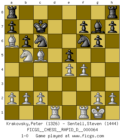 Last move : 1-0 2012 January 21 6:26:36 [Event "FICGS__CHESS__RAPID_D__000064"] [Site "FICGS"] [Date "2011.11.24"] [Round "1"] [White "Krakovsky,Peter"] [Black "Sentell,Steven"] [Result "1-0"] [WhiteElo "1326"] [BlackElo "1444"] 1.e4 c5 2.Nf3 d6 3.d4 cxd4 4.Nxd4 Nf6 5.Nc3 g6 6.Be2 Bg7 7.Be3 Bd7 8.O-O Nc6 9.f4 e5 10.Ndb5 Bc8 11.Qxd6 Qxd6 12.Nxd6+ Ke7 13.Bc5 b6 14.Nxc8+ Kd7 15.Rad1+ Kxc8 16.Ba6+ Kc7 17.Nb5+ 1-0 This chess game has been lost on time (started : 2011.11.24 11:20:6) Sicilian : Dragon variation Kingside Castling by player White (move 8) Player White won this chess game. Follow this game move after move (download)Nowadays, when you're not a grandmaster at 14, you can forget about it. (Anand Viswanathan) Bis zum Jahr 1971 verlief in meiner Schachkariere alles glatt. Dieses dramatische Match [Fischer-Taimanov 6:0] machte mein Leben zur Hölle. (Mark Taimanov) Hasta este punto, las blancas han seguido un análisis bien conocido. Pero ahora el hace un error fatal: empieza a usar su propia cabeza. (Siegbert Tarrasch) Le thème de l'attaque double intervient d'une manière ou d'une autre dans l'immense majorité des combinaisons. (Youri Averbakh) When it is a question of money, everybody is of the same religion. (Voltaire)