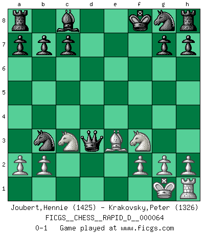 Last move : 0-1 2011 December 14 12:20:39 [Event "FICGS__CHESS__RAPID_D__000064"] [Site "FICGS"] [Date "2011.11.24"] [Round "1"] [White "Joubert,Hennie"] [Black "Krakovsky,Peter"] [Result "0-1"] [WhiteElo "1425"] [BlackElo "1326"] 1.e4 e5 2.Nf3 Nc6 3.Bc4 Bc5 4.d4 exd4 5.c3 dxc3 6.Bxf7+ Kxf7 7.Qd5+ Kf8 8.Qxc5+ Qe7 9.Qc4 d5 10.Qxd5 Nb4 11.Qb3 Qxe4+ 12.Kf1 Nc2 13.Nxc3 Qd3+ 14.Kg1 Nxa1 15.Be3 Nxb3 0-1 Giuoco Piano Player Black won this chess game. Follow this game move after move (download)Whoever sees no other aim in the game than that of giving checkmate to one's opponent will never become a good Chess player. (Euwe) Ich war schon mal beim Dopingtest. Da musste ich Urin abgeben, während Dritte zusahen. (Elisabeth Pähtz) Un Peón pasado es un criminal, quién debe ser mantenido bajo candado y llave. Leves medidas, tales como vigilancia policiaca, no son suficientes. (Aaron Nimzovich) Des idées, des idées, j'en ai cent, j'en ai mille. Des bonnes, des mauvaises, applicables, irréalisables... Il suffit de faire le tri ! (Roos) I live to kill Traxler counterattack. (Ilmars Cirulis)