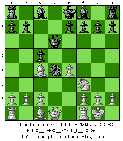 Last move : 1-0 2012 January 6 17:34:12 [Event "FICGS__CHESS__RAPID_D__000064"] [Site "FICGS"] [Date "2011.11.24"] [Round "1"] [White "Di Giandomenico,Alfonso"] [Black "Nath,Raj"] [Result "1-0"] [WhiteElo "1488"] [BlackElo "1300"] 1.e4 c5 2.Nf3 d5 3.exd5 Qxd5 4.Nc3 Qd6 5.Bc4 Nf6 6.O-O Nc6 7.d3 Nd4 8.Ne4 Nxe4 9.dxe4 1-0 This chess game has been lost on time (started : 2011.11.24 11:20:6) Sicilian defense Kingside Castling by player White (move 6) Player White won this chess game. Follow this game move after move (download)Nonsense was the last thing Fischer was interested in, as far as Chess was concerned. (Elie Agur) Was ist der Unterschied zwischen einem Strassenarbeiter und einem Schachspieler? --Der Schachspieler bewegt sich ab und zu. (Anonymous) Botvinnik trató de alejar el misterio referente al Ajedrez, siempre relacionandolo a situaciones de la vida diaria. Solía llamar al Ajedrez un problema inexacto típico, similar a aquellos en que la gente tiene siempre que resolver a cada día. (Garry Kasparov) Les Echecs sont affaire de jugement sensible. Savoir quand frapper et quand esquiver. (Fischer) Question: Is 'This statement is paradoxical' a paradoxical statement ? Or is it a meta-paradox ? (Normajean Yates)