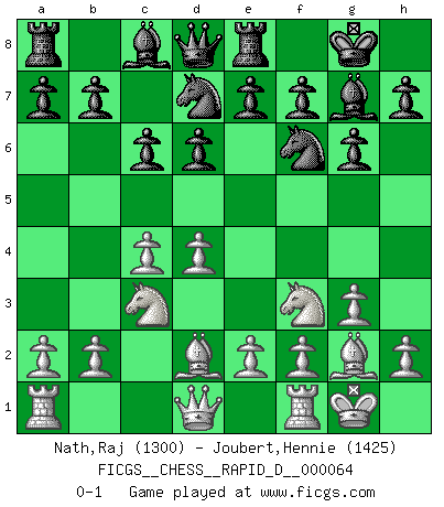 Last move : 0-1 2012 January 12 5:51:20 [Event "FICGS__CHESS__RAPID_D__000064"] [Site "FICGS"] [Date "2011.11.24"] [Round "1"] [White "Nath,Raj"] [Black "Joubert,Hennie"] [Result "0-1"] [WhiteElo "1300"] [BlackElo "1425"] 1.c4 Nf6 2.Nf3 g6 3.Nc3 Bg7 4.g3 O-O 5.Bg2 d6 6.O-O c6 7.d4 Nbd7 8.Bd2 Re8 0-1 This chess game has been lost on time (started : 2011.11.24 11:20:6) English Opening Kingside Castling by player Black (move 4) Kingside Castling by player White (move 6) Player Black won this chess game. Follow this game move after move (download)Via the squares on the chessboard, the Indians explain the movement of time and the age, the higher influences which control the world and the ties which link Chess with the human soul. (Al-Masudi) Es ist besser die Steine des Gegners zu opfern. (Savielly Grigorievitsch Tartakower) No hay precio que sea tan grande por la cabellera del Rey enemigo. (Koblentz) Le génie consiste à savoir transgresser les règles au moment opportun. (Teichmann) It's not enough to succeed. Others must fail. (Gore Vidal)