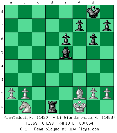 Last move : 0-1 2012 February 6 3:2:11 [Event "FICGS__CHESS__RAPID_D__000064"] [Site "FICGS"] [Date "2011.11.24"] [Round "1"] [White "Piantadosi,Angelo"] [Black "Di Giandomenico,Alfonso"] [Result "0-1"] [WhiteElo "1420"] [BlackElo "1488"] 1.d4 e6 2.e4 c5 3.Nf3 cxd4 4.Nxd4 d6 5.Nc3 Nf6 6.Bc4 Qc7 7.Bb3 Be7 8.O-O a6 9.f4 Nbd7 10.Be3 Nc5 11.Qf3 Nxb3 12.Nxb3 b5 13.e5 Bb7 14.Qg3 Nh5 15.Qg4 g6 16.Rad1 Ng7 17.Rd2 O-O 18.Rfd1 Nf5 19.Bf2 Rfd8 20.Qe2 Qc6 21.Be1 b4 22.Nb1 dxe5 23.fxe5 Rxd2 24.Rxd2 a5 25.c3 a4 26.Nd4 Bc5 27.Kf1 Nxd4 28.cxd4 Ba6 29.Rd3 Bxd3 30.Qxd3 Rd8 31.Bf2 Qd5 32.Qb5 Bxd4 33.Qxb4 Bxe5 34.Qxa4 Qd1+ 35.Qxd1 Rxd1+ 0-1 Queen's pawn Kingside Castling by player White (move 8) Kingside Castling by player Black (move 17) Player Black won this chess game. Follow this game move after move (download)Do you realize Fischer almost never has any bad pieces? He exchanges them, and the bad pieces remain with his opponents. (Yuri Balashov) Obwohl ich alt bin, darf mir niemand den Finger in den Mund stecken, sonst beisse ich. (Wilhelm Steinitz) Aquel que toma al Peón de Caballo de la Reina, se pasará la noche a dormir en la calle. (Anónimo) Toutes choses étant égales, c'est la conviction qui gagne. Alliée à une volonté de vaincre, elle sert de détonateur, suscite des idées, disperse les doutes et aide à penser clairement. (Robert Fischer) I find television to be very educating. Every time somebody turns on the set, I go in the other room and read a book. (Groucho Marx)