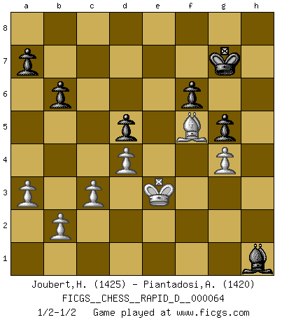 Last move : 1/2-1/2 2012 March 22 2:40:24 [Event "FICGS__CHESS__RAPID_D__000064"] [Site "FICGS"] [Date "2011.11.24"] [Round "1"] [White "Joubert,Hennie"] [Black "Piantadosi,Angelo"] [Result "1/2-1/2"] [WhiteElo "1425"] [BlackElo "1420"] 1.e4 e6 2.e5 d5 3.exd6 cxd6 4.Nf3 Nf6 5.d4 Nc6 6.c3 Be7 7.Bd3 O-O 8.O-O b6 9.Bg5 Bb7 10.Nbd2 Rc8 11.Rc1 Nd5 12.Bxe7 Qxe7 13.Re1 Nf4 14.Bc2 Na5 15.Nf1 Nc4 16.Rb1 Qf6 17.Ne3 Nh3+ 18.Kf1 Nxe3+ 19.Rxe3 Ng5 20.Nxg5 Qxg5 21.Rg3 Qa5 22.Qg4 g6 23.a3 d5 24.h4 Qb5+ 25.Kg1 Ba6 26.h5 Qe2 27.Qxe2 Bxe2 28.hxg6 hxg6 29.Re1 Bb5 30.Rh3 Kg7 31.g3 Rh8 32.Rxh8 Rxh8 33.Kg2 Kf6 34.Rh1 Rxh1 35.Kxh1 Kg5 36.Kg2 f6 37.f4+ Kh6 38.g4 g5 39.f5 Bd7 40.fxe6 Bxe6 41.Kf3 Bf7 42.Bf5 Bg6 43.Be6 Be4+ 44.Kg3 Kg6 45.Kf2 Kg7 46.Ke3 Bh1 47.Bf5 1/2-1/2 French : Steinitz attack Kingside Castling by player Black (move 7) Kingside Castling by player White (move 8) This chess game ended in a draw. Follow this game move after move (download)If you aren't afraid of Spassky, then I have removed the element of money. (Jim Slater) Wenn ich gewinne bin ich ein Genie. Wenn nicht, dann bin ich keines. (Robert James Fischer) Ayuda a tus piezas para que ellas te puedan ayudar. (Paul Morphy) La vérité est comme le meilleur coup aux échecs : elle existe, mais il faut la chercher. (Arturo Perez-Reverte) Philosophers use a language that is already deformed as though by shoes that are too tight. (Ludwig Wittgenstein)