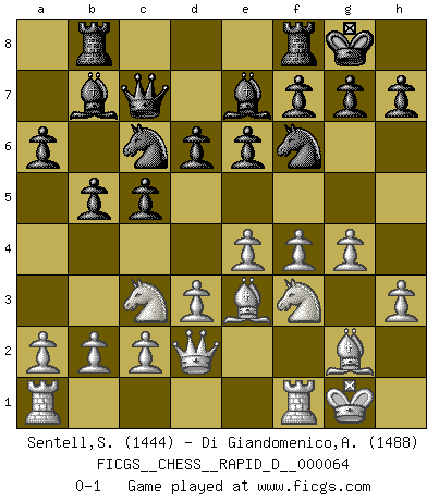 Last move : 0-1 2012 January 20 18:26:56 [Event "FICGS__CHESS__RAPID_D__000064"] [Site "FICGS"] [Date "2011.11.24"] [Round "1"] [White "Sentell,Steven"] [Black "Di Giandomenico,Alfonso"] [Result "0-1"] [WhiteElo "1444"] [BlackElo "1488"] 1.e4 c5 2.Nc3 e6 3.g3 Nc6 4.Bg2 a6 5.d3 d6 6.f4 Nf6 7.Nf3 Be7 8.O-O Qc7 9.Be3 Rb8 10.Qd2 O-O 11.h3 b5 12.g4 Bb7 0-1 This chess game has been lost on time (started : 2011.11.24 11:20:6) Sicilian : Closed Kingside Castling by player White (move 8) Kingside Castling by player Black (move 10) Player Black won this chess game. Follow this game move after move (download)The chessboard is the world, the pieces are the phenomena of the Universe, the rules of the game are what we call the laws of Nature and the player on the other side is hidden from us. (Thomas Huxley) Es macht mich traurig, wenn ich sehe, dass Golfprofis mehr verdienen als Schachsportler. Obwohl ich davon überzeugt bin, dass wir Schachspieler viel härter trainieren müssen als die Golfer. (Alexandra Kosteniuk) Coloca el contenido del tablero de Ajedrez en un sombrero, agita las piezas vigorosamente, derrámalas en el tablero desde una altura de medio metro y así obtienes el estilo de Wilhelm Steinitz. (H. E. Bird) Il vaut mieux sacrifier les pièces de l'adversaire. (Xavier Tartacover) Coffee just isn't my cup of tea. (Unknown)