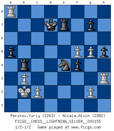 Last move : 1/2-1/2 2011 November 24 14:26:36 [Event "FICGS__CHESS__LIGHTNING_SILVER__000155"] [Site "FICGS"] [Date "2011.11.24"] [Round "1"] [White "Perikov,Yuriy"] [Black "Alcala,Alvin"] [Result "1/2-1/2"] [WhiteElo "2263"] [BlackElo "2382"] 1.e4 c5 2.Nf3 d6 3.d4 cxd4 4.Nxd4 Nf6 5.Nc3 a6 6.h3 e5 7.Nde2 h5 8.Bg5 Be7 9.a3 Be6 10.Qd2 Nbd7 11.O-O-O b5 12.f4 Qa5 13.Ng3 Rc8 14.Nf5 Bxf5 15.exf5 b4 16.axb4 Qxb4 17.h4 O-O 18.Kb1 Rb8 19.b3 Nc5 20.Rh3 Rfe8 21.Nd5 Qxd2 22.Nxe7+ Rxe7 23.Rxd2 Nfe4 24.Rxd6 f6 25.Bc4+ Kf8 26.Rc6 Ke8 27.Kc1 Kd7 28.Bd5 Rb4 29.Kb2 a5 30.Bxe4 Nxe4 31.Ra6 fxg5 32.hxg5 exf4 33.Ra7+ Ke8 34.Ra8+ Kd7 1/2-1/2 Sicilian : Najdorf, Adams attack Queenside Castling by player White (move 11) Kingside Castling by player Black (move 17) This chess game ended in a draw. Follow this game move after move (download)Fischer Chess play was always razor-sharp, rational and brilliant. One of the best ever. (Dave Regis) Der Bart als Geschlechtszeichen mitten im Gesicht ist obszön. Daher gefällt er den Weibern. [Zugegeben, kein Schachzitat, aber unglaublich originell] (Arthur Schopenhauer) Algunos sacrificios son sólidos, los demás son míos. (Mikhail Tal) Tous ces prétendus hommes politiques sont les pions, les Cavaliers, les Tours ou les Fous d'une partie d'échecs qui se jouera tant qu'un hasard ne renversera pas l'échiquier. (Honoré de Balzac) Hold em is to stud what chess is to checkers. (Johnny Moss)