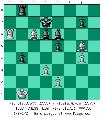 Last move : 1/2-1/2 2011 November 24 16:33:40 [Event "FICGS__CHESS__LIGHTNING_SILVER__000156"] [Site "FICGS"] [Date "2011.11.24"] [Round "1"] [White "Nichols,Scott"] [Black "Alcala,Alvin"] [Result "1/2-1/2"] [WhiteElo "2355"] [BlackElo "2379"] 1.g3 d5 2.Nf3 Nf6 3.Bg2 c6 4.O-O Bf5 5.d3 h6 6.c4 e6 7.cxd5 cxd5 8.Qb3 Qb6 9.Qxb6 axb6 10.Nd4 Bg4 11.Nc3 Nc6 12.Ndb5 Ra5 13.Re1 Bc5 14.h3 Bh5 15.Bd2 O-O 16.a3 d4 17.b4 dxc3 18.Nxc3 Nxb4 19.axb4 Rxa1 20.Rxa1 Bxb4 21.Kf1 Rc8 22.Ne4 Be7 23.g4 Nxe4 24.Bxe4 Bg6 25.Bxb7 Rb8 26.Ra7 Bd6 27.Ke1 b5 28.Be3 h5 29.Kd1 f6 30.Bc6 hxg4 31.hxg4 b4 32.Bb7 Bf7 33.Kc2 f5 34.f3 fxg4 35.fxg4 e5 36.Kb1 Kf8 37.Be4 Be6 38.Ra6 Ke7 39.Bg5+ Kd7 40.Bc6+ 1/2-1/2 Benko's Opening Kingside Castling by player White (move 4) Kingside Castling by player Black (move 15) This chess game ended in a draw. Follow this game move after move (download)The essence of Chess is thinking about what Chess is. (David Bronstein) Obendrein hat der FIDE-Präsident den Revolutionsführer Gaddafi zum »Großmeister« ernannt, am Ende der WM. Das ist lächerlich! (Joel Lautier) Tu no necesitas jugar muy bien, únicamente ayudar a tu oponenet a que juegue muy mal. (Genrikh Chepukaitis) Les réformistes prétendent que les progrès de la théorie conduiront à la disparition des échecs, et qu'il faut, pour leur rendre vie, en remanier les règles. En réalité, qu'exprime cette affirmation? Le mépris de l'intuition, de l'imagination et de tous les autres éléments qui font des échecs un art. (Alexander Alekhine) Always two there are. No more no less. A master, and an apprentice. (Master Yoda in Star Wars ep.1)