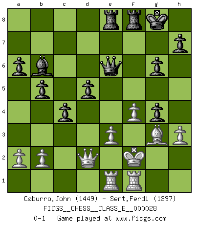 Last move : 0-1 2007 January 21 11:51:23 [Event "FICGS__CHESS__CLASS_E__000028"] [Site "FICGS"] [Date "2007.01.07"] [Round "1"] [White "Caburro,John"] [Black "Sert,Ferdi"] [Result "0-1"] [WhiteElo "1449"] [BlackElo "1397"] 1.d4 Nf6 2.c4 g6 3.Nc3 d5 4.Nf3 Bg7 5.Bg5 c6 6.e3 O-O 7.Rc1 Bg4 8.h3 Bf5 9.Be2 Nbd7 10.O-O dxc4 11.Bxc4 b5 12.Bb3 a6 13.g4 Be4 14.Ne5 Bd5 15.Bxd5 cxd5 16.Nc6 Qe8 17.Qb3 e6 18.Bh4 Nb6 19.Ne5 Nc4 20.Nxc4 dxc4 21.Qc2 Nd5 22.Nxd5 exd5 23.Bg3 Qe6 24.Rce1 f5 25.Qe2 Rae8 26.f4 Bxd4 27.Kf2 Bb6 28.Qd2 fxg4 0-1 King's Indian defense, 3.Nc3 Kingside Castling by player Black (move 6) Kingside Castling by player White (move 10) Player Black won this chess game. Follow this game move after move (download)You must take your opponent into a deep dark forest where 2+2=5, and the path leading out is only wide enough for one. (Mikhail Tal) Je mehr ich von der FIDE weiss, um so weniger verstehe ich. (Alexander Kalifman) Para mi, el Ajedrez es la vida y cada partida es como una nueva vida. Todo jugador de Ajedrez suele vivir muchas vidas durante su vida. (Eduard Gufeld) En blitz, le Cavalier l'emporte sur le Fou. (Vlastimil Hort) 'preceded by its own quotation yields a falsehood' preceded by its own quotation yields a falsehood. (W. V. O. Quine - Set Theory And Its Logic, 1953)