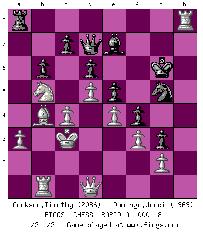 Last move : 1/2-1/2 2012 May 13 16:27:27 [Event "FICGS__CHESS__RAPID_A__000118"] [Site "FICGS"] [Date "2011.11.24"] [Round "1"] [White "Cookson,Timothy"] [Black "Domingo,Jordi"] [Result "1/2-1/2"] [WhiteElo "2086"] [BlackElo "1969"] 1.e3 e5 2.c4 d6 3.Nc3 g6 4.d4 Nd7 5.Nf3 Bg7 6.Be2 Ne7 7.O-O O-O 8.d5 h6 9.e4 f5 10.Be3 f4 11.Bd2 a5 12.a3 g5 13.h3 Ng6 14.Rc1 Rf7 15.Re1 Bf8 16.Nh2 Nf6 17.Ng4 Nh4 18.Nxf6+ Qxf6 19.Bh5 Rg7 20.f3 Bd7 21.Rf1 Be8 22.Bxe8 Rxe8 23.Be1 Ng6 24.Nb5 b6 25.Qe2 a4 26.Rc3 h5 27.Qd1 Ra8 28.b4 axb3 29.Rxb3 Qd8 30.Kh2 Be7 31.Rh1 Qd7 32.Kg1 Nf8 33.Qc2 Nh7 34.Kf2 Nf6 35.Ke2 g4 36.hxg4 hxg4 37.Bf2 Kf7 38.R3b1 R7g8 39.Kd3 g3 40.Be1 Rgc8 41.Qb3 Kg6 42.Bb4 Nh7 43.Kc3 Ng5 44.Qd1 Rh8 45.Rxh8 1/2-1/2 Van't Kruijs Opening Kingside Castling by player White (move 7) Kingside Castling by player Black (move 7) This chess game ended in a draw. Follow this game move after move (download)I believe that Chess possesses a magic that is also a help in advanced age. A rheumatic knee is forgotten during a game of Chess and other events can seem quite unimportant in comparison with a catastrophe on the chessboard. (Vlastimil Hort) Ivan Sokolov treibt mich als Beifahrer an mit go Loeky go - . (Loek van Wely) Bobby Fischer es el mas grande genio de Ajedrez de todos los tiempos. (Alexander Kotov) Les Echecs sont et restent toujours un combat, un combat intégral comme la boxe, la lutte ou un autre sport, et où il doit y avoir un vainqueur et un vaincu. (Joseph Emil Diemer) A clear conscience is usually the sign of a bad memory. (Unknown)