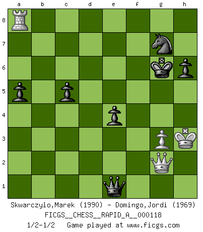 Last move : 1/2-1/2 2012 March 19 17:44:31 [Event "FICGS__CHESS__RAPID_A__000118"] [Site "FICGS"] [Date "2011.11.24"] [Round "1"] [White "Skwarczylo,Marek"] [Black "Domingo,Jordi"] [Result "1/2-1/2"] [WhiteElo "1990"] [BlackElo "1969"] 1.d4 h6 2.e4 c5 3.d5 d6 4.b3 Nf6 5.Bd3 g5 6.Bb2 Bg7 7.Nf3 Nbd7 8.O-O a6 9.h3 Qc7 10.a4 b6 11.Na3 Rg8 12.Nc4 g4 13.hxg4 Nxg4 14.Bxg7 Rxg7 15.Qd2 Ndf6 16.Rfe1 Kf8 17.Rad1 b5 18.Nb2 Bd7 19.Ra1 Qb7 20.c4 bxa4 21.bxa4 Qb4 22.Qc1 Rb8 23.Re2 Qa5 24.Bb1 e5 25.dxe6 Bxe6 26.Nd3 Nd7 27.Nf4 Nde5 28.Nxe6+ fxe6 29.Nxe5 Nxe5 30.Ra3 Ke7 31.f4 Qb4 32.Ba2 Nc6 33.f5 Nd4 34.Rf2 Rg4 35.Re3 e5 36.Kh2 Rh4+ 37.Rh3 Rxh3+ 38.Kxh3 Rg8 39.g3 Rg5 40.f6+ Kf7 41.Rb2 Qxa4 42.Rb7+ Kxf6 43.Qf1+ Nf5 44.Bb1 Rh5+ 45.Kg2 Qc6 46.Rb8 Kg6 47.Qf2 Ng7 48.Rd8 Qb6 49.Rd7 Rg5 50.Bc2 Kh7 51.Qf8 Qb2 52.Qf2 Rg6 53.Ra7 Qc3 54.Bd1 Qxc4 55.Qf5 Qe6 56.Bg4 Qa2+ 57.Kh3 Qb3 58.Rd7 a5 59.Qf2 Rxg4 60.Kxg4 Qd1+ 61.Kh3 Qh1+ 62.Qh2 Qxe4 63.Rxd6 Nf5 64.Rd7+ Kg6 65.Qg2 Qe3 66.Rd8 e4 67.Rg8+ Ng7 68.Ra8 Qe1 1/2-1/2 Queen's pawn Kingside Castling by player White (move 8) This chess game ended in a draw. Follow this game move after move (download)Good positions don't win games, good moves do. (Gerald Abrahams) Der 70jährige Viktor Kortschnoi: Die Rentenanstalt wollte mich zwingen in Rente zu gehen. Meine Frau erhält jetzt eine Pension- und ich zahle weiter in die Rentenkasse ein! (Viktor Kortschnoi) Ayuda a tus piezas para que ellas te puedan ayudar. (Paul Morphy) Toute estimation doit être constamment réévaluée. (Jacob Estrin) When you have everything, sometimes it feels like nothing. (Horatio Caine, C.S.I. Miami)