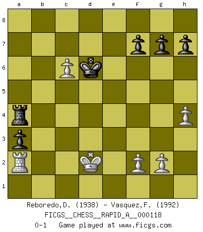 Last move : 0-1 2012 March 27 16:3:45 [Event "FICGS__CHESS__RAPID_A__000118"] [Site "FICGS"] [Date "2011.11.24"] [Round "1"] [White "Reboredo,Daniel"] [Black "Vasquez,Fernando"] [Result "0-1"] [WhiteElo "1938"] [BlackElo "1992"] 1.e4 e5 2.Nf3 Nf6 3.Nxe5 d6 4.Nf3 Nxe4 5.d4 Be7 6.Bd3 d5 7.Nc3 Nxc3 8.bxc3 O-O 9.O-O c5 10.dxc5 Nd7 11.c6 bxc6 12.Rb1 Nc5 13.Re1 Bd6 14.c4 Qa5 15.Bd2 Qxa2 16.Ra1 Qb2 17.Be3 Nxd3 18.Qxd3 Qb7 19.cxd5 cxd5 20.Bd2 Bc5 21.Bc3 Qb6 22.Rab1 Qc6 23.Bd4 Bd6 24.Be5 a5 25.h4 a4 26.c4 Bxe5 27.cxd5 Qc3 28.Nxe5 Qxd3 29.Nxd3 Bf5 30.Rbd1 a3 31.Nb4 Bd7 32.Nc6 Rfe8 33.Kf1 Kf8 34.Ra1 Rxe1+ 35.Kxe1 Bxc6 36.dxc6 Ke7 37.Kd2 Kd6 38.Ra2 Ra4 0-1 Petrov : Classical attack Kingside Castling by player Black (move 8) Kingside Castling by player White (move 9) Player Black won this chess game. Follow this game move after move (download)Modern Chess is too much concerned with things like Pawn structure. Forget it, Checkmate ends the game. (Nigel Short) Ein bischen Romantik kann weder im Schach noch in der Liebe schaden. Also versuche ich mich ab und zu daran zu erinnern. (Nigel Short) Durante una competencia de Ajedrez, un Maestro de Ajedrez deberá ser una combinación de presa de caza y un Monge. (Alexander Alekhine) Le génie consiste à savoir transgresser les règles au moment opportun. (Teichmann) True nature is revealed in times of difficulty. (Chinese proverb)