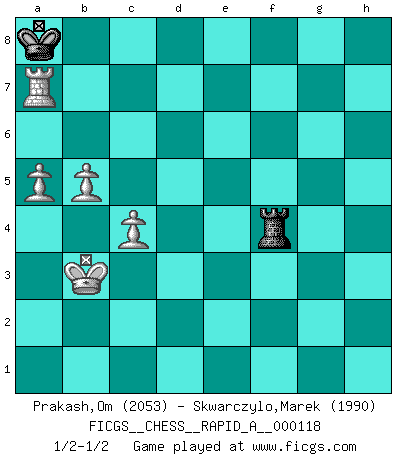 Last move : 1/2-1/2 2012 March 26 19:37:51 [Event "FICGS__CHESS__RAPID_A__000118"] [Site "FICGS"] [Date "2011.11.24"] [Round "1"] [White "Prakash,Om"] [Black "Skwarczylo,Marek"] [Result "1/2-1/2"] [WhiteElo "2053"] [BlackElo "1990"] 1.e4 c5 2.Nf3 Nc6 3.d4 cxd4 4.Nxd4 Nf6 5.Nc3 e5 6.Ndb5 d6 7.Bg5 a6 8.Na3 b5 9.Nd5 Be7 10.Bxf6 Bxf6 11.c3 O-O 12.Nc2 Rb8 13.h4 Ne7 14.Nxf6+ gxf6 15.Qh5 f5 16.Qg5+ Kh8 17.Qf6+ Kg8 18.O-O-O Be6 19.Bd3 f4 20.g3 fxg3 21.h5 Nc6 22.Qh6 Kh8 23.Be2 g2 24.Rhg1 Rg8 25.Rxd6 Qh4 26.Rxc6 Qh1 27.Qf6+ Rg7 28.h6 Qxg1+ 29.Kd2 Qc1+ 30.Kxc1 g1Q+ 31.Kd2 Qg5+ 32.Qxg5 Rxg5 33.Rxa6 Rg6 34.Nb4 Bc4 35.Bxc4 bxc4 36.Ra7 Rf8 37.Rc7 Rxh6 38.Ke2 Rh1 39.Rxc4 h5 40.Nc6 h4 41.Nxe5 h3 42.Ng4 h2 43.Kf3 Kg7 44.a4 Rh8 45.Nxh2 R8xh2 46.b4 Rf1 47.Ke3 R1xf2 48.Rc8 Ra2 49.a5 Kf6 50.Kd4 Ke7 51.Rb8 Kd6 52.Rb7 Rhf2 53.e5+ Kc6 54.Rb6+ Kc7 55.Ra6 Rad2+ 56.Kc4 Kb8 57.Rb6+ Ka7 58.b5 Rd7 59.Kb3 Rb7 60.Ra6+ Kb8 61.c4 Rf4 62.e6 fxe6 63.Rxe6 Rc7 64.Rb6+ Ka8 65.Ra6+ Ra7 66.Rxa7+ 1/2-1/2 Sicilian : Pelikan (Lasker/Sveshnikov) variation Kingside Castling by player Black (move 11) Queenside Castling by player White (move 18) Promotion Queen by player Black (move 30) 10 pieces endgame at move 47 : White KRPPPP , Black KRRP WHITE : King + 1 Rook 4 Pawns BLACK : King + 2 Rooks 1 Pawn 9 pieces endgame at move 62 : White KRPPP , Black KRRP WHITE : King + 1 Rook 3 Pawns BLACK : King + 2 Rooks 1 Pawn 8 pieces endgame at move 63 : White KRPPP , Black KRR WHITE : King + 1 Rook 3 Pawns BLACK : King + 2 Rooks 7 pieces endgame at move 66 : White KRPPP , Black KR WHITE : King + 1 Rook 3 Pawns BLACK : King + 1 Rook This chess game ended in a draw. Follow this game move after move (download)A chess genius has died; a loss for humanity. (Viktor Kortchnoi, about Bobby Fischer's death) Ich war zu klein für die Schach-Schülermannschaft! (Woody Allen) Yo tuve un dolor de muelas en la primer partida. En el segundo juego, tuve un dolor de cabeza. En el tercero, tuve un ataque de reumatísmo. En la cuarta partida, no me sentía muy bien. ¿Y en el quinto juego? Bueno, ¿que acaso uno tiene que ganar todos los juegos?. (Siegbert Tarrasch) Les échecs sont utiles à l'exercice de la faculté de penser et à celle de l'imagination. Car nous devons posséder une méthode élaborée pour atteindre des buts partout où nous devons conduire notre raison. (Leibnitz) Luck never gives; it only lends. (Swedish proverb)