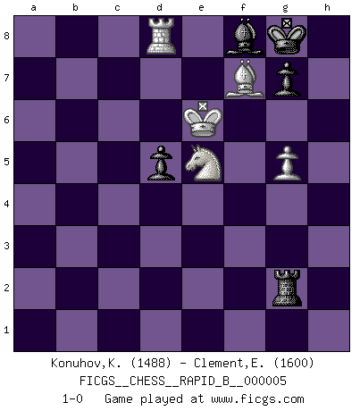 Last move : 1-0 2006 June 27 17:21:10 [Event "FICGS__CHESS__RAPID_B__000005"] [Site "FICGS"] [Date "2006.05.10"] [Round "1"] [White "Konuhov,Konstantin"] [Black "Clement,Etienne"] [Result "1-0"] [WhiteElo "1488"] [BlackElo "1600"] 1.d4 Nf6 2.Nc3 d5 3.Nf3 c6 4.e3 Bg4 5.h3 Bf5 6.Nh4 Bd7 7.Bd3 c5 8.O-O c4 9.Be2 e6 10.Nf3 Bb4 11.Bd2 Nc6 12.b3 cxb3 13.axb3 O-O 14.Bd3 a6 15.Na4 Be7 16.c4 Nb4 17.Bxb4 Bxb4 18.cxd5 exd5 19.Nc5 Bc8 20.Qc2 Qb6 21.Rfc1 Rd8 22.Ne5 h6 23.Na4 Qd6 24.Qc7 Qxc7 25.Rxc7 Bd6 26.Rc2 Rb8 27.Nc5 Re8 28.Rac1 Kf8 29.b4 Kg8 30.b5 a5 31.b6 Ra8 32.Bb5 Rf8 33.Ned3 Rd8 34.Ra2 Bf8 35.Rca1 Rd6 36.Rxa5 Rxa5 37.Rxa5 Rxb6 38.Na4 Rd6 39.Ra8 Bf5 40.Ne5 Bc2 41.Nc5 Nh7 42.Be8 Bg6 43.Nxb7 Re6 44.Nxg6 Rxg6 45.Nd8 Rf6 46.Ra7 Ng5 47.f4 Rd6 48.Nxf7 Re6 49.Bd7 Rxe3 50.Ne5 Re4 51.h4 Rxd4 52.hxg5 hxg5 53.Be6+ Kh7 54.fxg5 Rd1 55.Kh2 Re1 56.Bf5+ Kg8 57.Nf3 Bd6+ 58.Kh3 Re3 59.Bg6 Be7 60.Kg4 Bc5 61.Ra8+ Bf8 62.Kf5 Ra3 63.Rd8 Ra2 64.Ne5 Rf2+ 65.Ke6 Rxg2 66.Bf7+ 1-0 Queen's pawn game Kingside Castling by player White (move 8) Kingside Castling by player Black (move 13) 10 pieces endgame at move 65 : White KRBNP , Black KRBPP WHITE : King + 1 Rook 1 Bishop 1 Knight 1 Pawn BLACK : King + 1 Rook 1 Bishop 2 Pawns Player White won this chess game. Follow this game move after move (download)The Pawns are the soul of the game. (Francois Andre Danican Philidor) Wenn es im Universum noch irgendwo intelligente Lebewesen gibt, dann kennen sie Go. (Emanuel Lasker) El muchacho (en ese entonces un niño de 12 años llamado Anatoly Karpov) no tiene ni idea de lo que es el Ajedrez y no hay futuro en absoluto para el en esta profesión. (Mikhail Botvinnik) Mais l'homme est une créature légère et illogique : semblable au joueur d'échecs, il n'aime que le processus du but à atteindre, non le but lui-même. (Dostoïevsky) Before all elsed, be armed. (Niccolo Machiavelli)