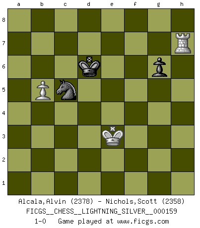 Last move : 1-0 2011 November 25 16:52:46 [Event "FICGS__CHESS__LIGHTNING_SILVER__000159"] [Site "FICGS"] [Date "2011.11.25"] [Round "1"] [White "Alcala,Alvin"] [Black "Nichols,Scott"] [Result "1-0"] [WhiteElo "2378"] [BlackElo "2358"] 1.e4 c5 2.Nf3 Nc6 3.Bb5 g6 4.O-O Bg7 5.Bxc6 bxc6 6.Re1 Nh6 7.c3 f6 8.d4 d5 9.Qa4 Bd7 10.dxc5 O-O 11.exd5 cxd5 12.Qd1 e6 13.c4 dxc4 14.Qd4 e5 15.Qxc4+ Nf7 16.Nc3 Qc8 17.Be3 Be6 18.Qa4 Bd7 19.Qc2 Rb8 20.b3 Qb7 21.Nd2 f5 22.f3 Be6 23.Bf2 Qc6 24.Rad1 Rfe8 25.Na4 Qa6 26.Nb1 Bf6 27.Nbc3 Qc6 28.h3 Kg7 29.Qe2 Bg5 30.Nb2 Bf6 31.Qc2 Rf8 32.Ne2 Bd5 33.h4 Rfd8 34.Rd2 f4 35.Qc3 Rbc8 36.Red1 Kg8 37.Kh2 e4 38.Bd4 Bxd4 39.Rxd4 exf3 40.Nxf4 Qf6 41.Nxd5 Rxd5 42.Qxf3 Qe5+ 43.Qf4 Qxf4+ 44.Rxf4 Rxd1 45.Nxd1 Rxc5 46.Rd4 Re5 47.Kg3 Re7 48.Kf4 Re2 49.Ra4 Rxg2 50.Rxa7 Rh2 51.Kg3 Rd2 52.Ne3 Nd6 53.Kf4 Nf7 54.Kf3 Rd4 55.Ra4 Ne5+ 56.Ke2 Rd8 57.Re4 Nd3 58.Rc4 Ne5 59.Rc7 Rd4 60.a4 Rxh4 61.Nc2 Rf4 62.a5 Rf7 63.Rc8+ Kg7 64.b4 Ra7 65.Nd4 Re7 66.Kf1 Rf7+ 67.Kg2 Rd7 68.a6 Rxd4 69.a7 Rd2+ 70.Kf1 Ra2 71.a8Q Rxa8 72.Rxa8 Kf7 73.b5 Nd7 74.Ra6 Ke7 75.Kf2 Nc5 76.Ke3 Kd7 77.Ra7+ Kd6 78.Rxh7 1-0 Sicilian : Nimzovich-Rossolimo attack (with ...g6, without ...d6) Kingside Castling by player White (move 4) Kingside Castling by player Black (move 10) 10 pieces endgame at move 60 : White KRNPP , Black KRNPP WHITE : King + 1 Rook 1 Knight 2 Pawns BLACK : King + 1 Rook 1 Knight 2 Pawns 9 pieces endgame at move 68 : White KRPP , Black KRNPP WHITE : King + 1 Rook 2 Pawns BLACK : King + 1 Rook 1 Knight 2 Pawns Promotion Queen by player White (move 71) 8 pieces endgame at move 71 : White KRP , Black KRNPP WHITE : King + 1 Rook 1 Pawn BLACK : King + 1 Rook 1 Knight 2 Pawns 7 pieces endgame at move 72 : White KRP , Black KNPP WHITE : King + 1 Rook 1 Pawn BLACK : King + 1 Knight 2 Pawns 6 pieces endgame at move 78 : White KRP , Black KNP WHITE : King + 1 Rook 1 Pawn BLACK : King + 1 Knight 1 Pawn Player White won this chess game. Follow this game move after move (download)Spassky will not be psyched out by Fischer. (Mike Goodall) Heutzutage gewinnt im Turnier nicht derjenige Spieler, der weitreichende Pläne entwirft, sondern einfach jener, der Zug um Zug kämpft. (David Bronstein) Si el ingenio solamente fuese necesario para lucirse, las mujeres serían las mejores jugadoras de Ajedrez del mundo. (Albin) J'ai toujours senti une vague pitié pour l'homme qui ne connaît rien aux échecs, tout comme j'en aurais pour un homme ignorant de l'amour. Les Echecs, comme la musique ou comme l'amour, ont le pouvoir de rendre heureux. (Siegbert Tarrasch) The leaves of memory seemed to make a mournful rustling in the dark. (Henry Wadsworth Longfellow)