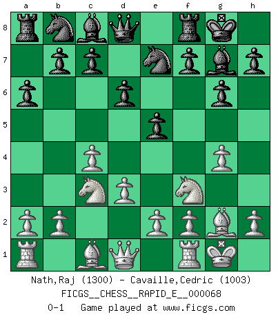 Last move : 0-1 2012 January 6 17:34:12 [Event "FICGS__CHESS__RAPID_E__000068"] [Site "FICGS"] [Date "2011.11.27"] [Round "1"] [White "Nath,Raj"] [Black "Cavaille,Cedric"] [Result "0-1"] [WhiteElo "1300"] [BlackElo "1003"] 1.c4 g6 2.Nf3 Bg7 3.g4 d6 4.Bg2 e5 5.Nc3 Ne7 6.O-O O-O 7.d3 a6 0-1 This chess game has been lost on time (started : 2011.11.27 19:28:36) English Opening Kingside Castling by player White (move 6) Kingside Castling by player Black (move 6) Player Black won this chess game. Follow this game move after move (download)Openings teach you openings. Endgames teach you chess ! (Stephan Gerzadowicz) Schach ist die gewalttätigste aller Sportarten. (Garry Kasparov) El Ajedrez te enseña a controlarl la excitación inicial que sientes cuando vez algo que parece bueno y te enseña a pensar objetivamente cuando te encuentras en problemas. (Stanley Kubrick) La victoire dans une partie d'Echecs appartient la plupart du temps à celui qui voit un peu plus loin que l'adversaire. (Lasker) Logic : The art of thinking and reasoning in strict accordance with the limitations and incapacities of the human misunderstanding. (Ambrose Bierce)